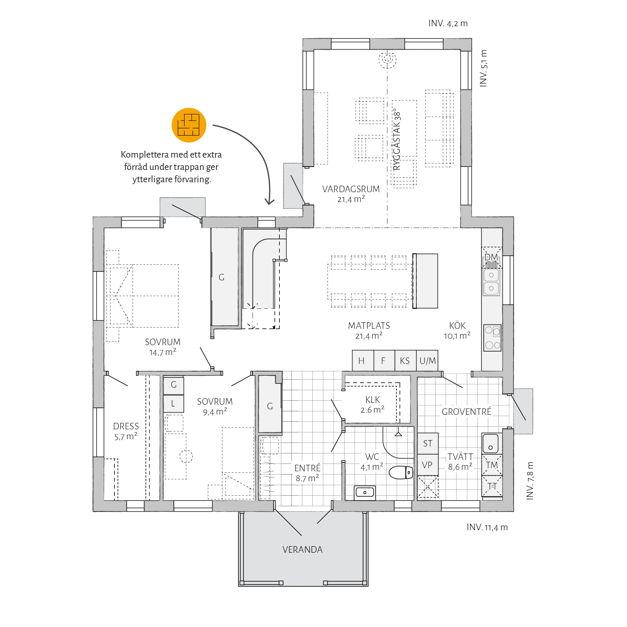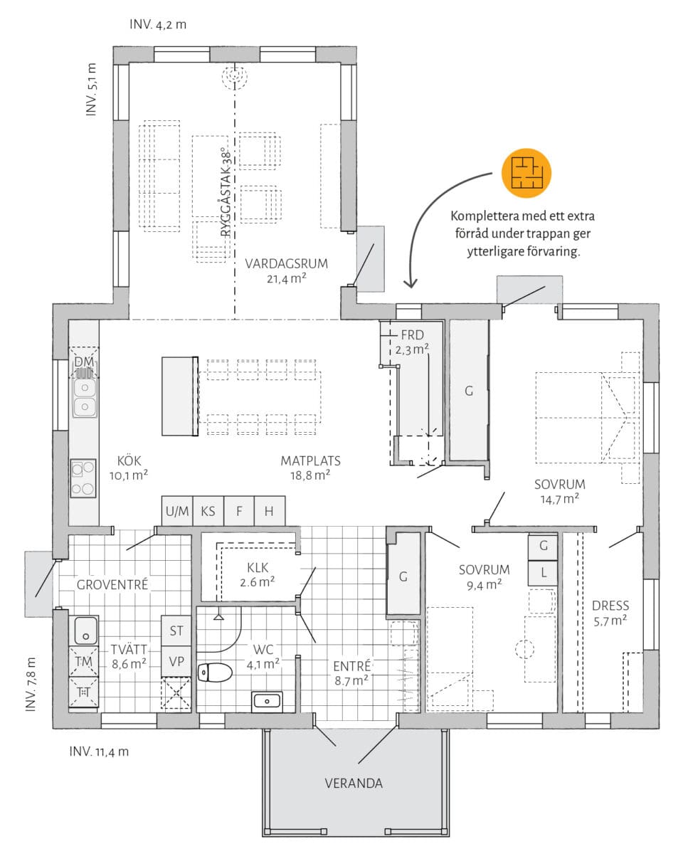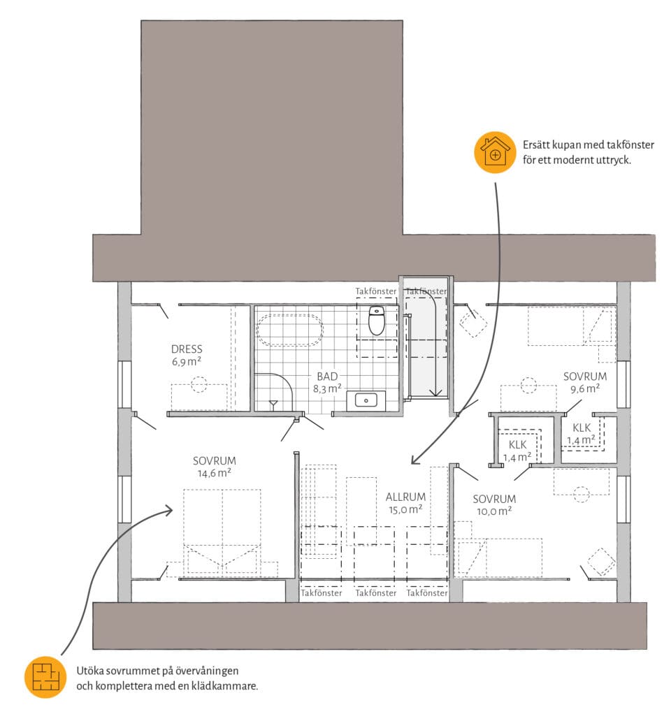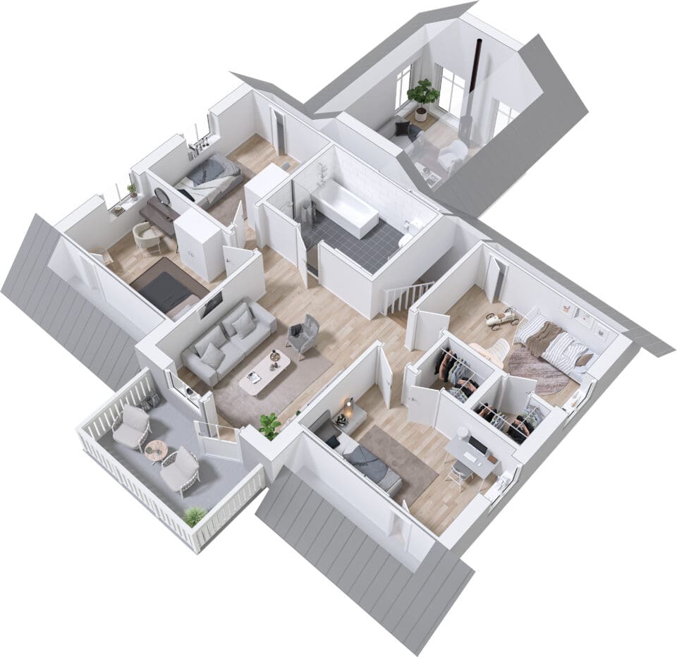 Med Björkhem kommer stora möjligheter. Skapa en lyxig känsla genom att utöka ett av sovrummen med en separat klädkammare. Komplettera med ett extra förråd under trappan för bättre förvaring. Vill du göra mer själv? Välj leverans med oinredd övervåning.