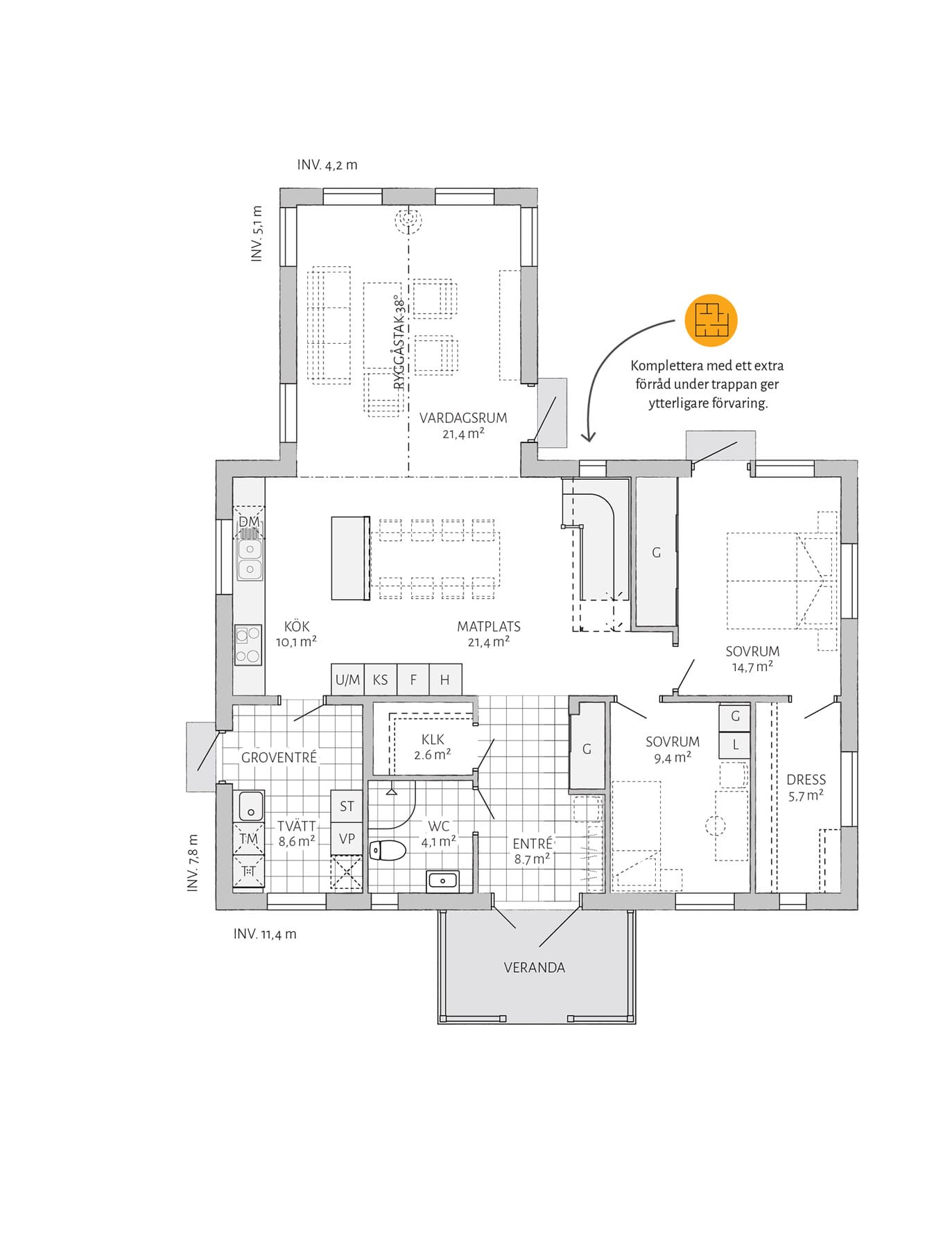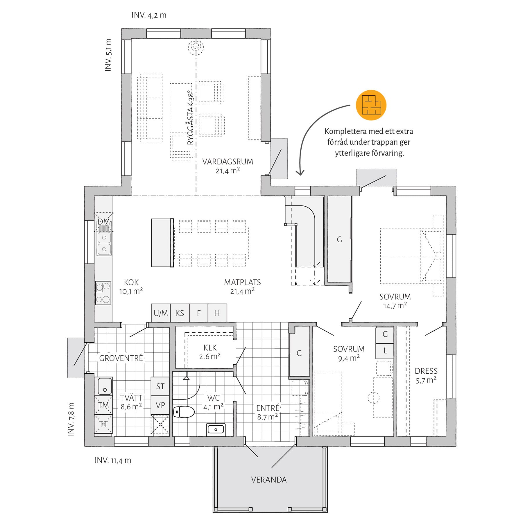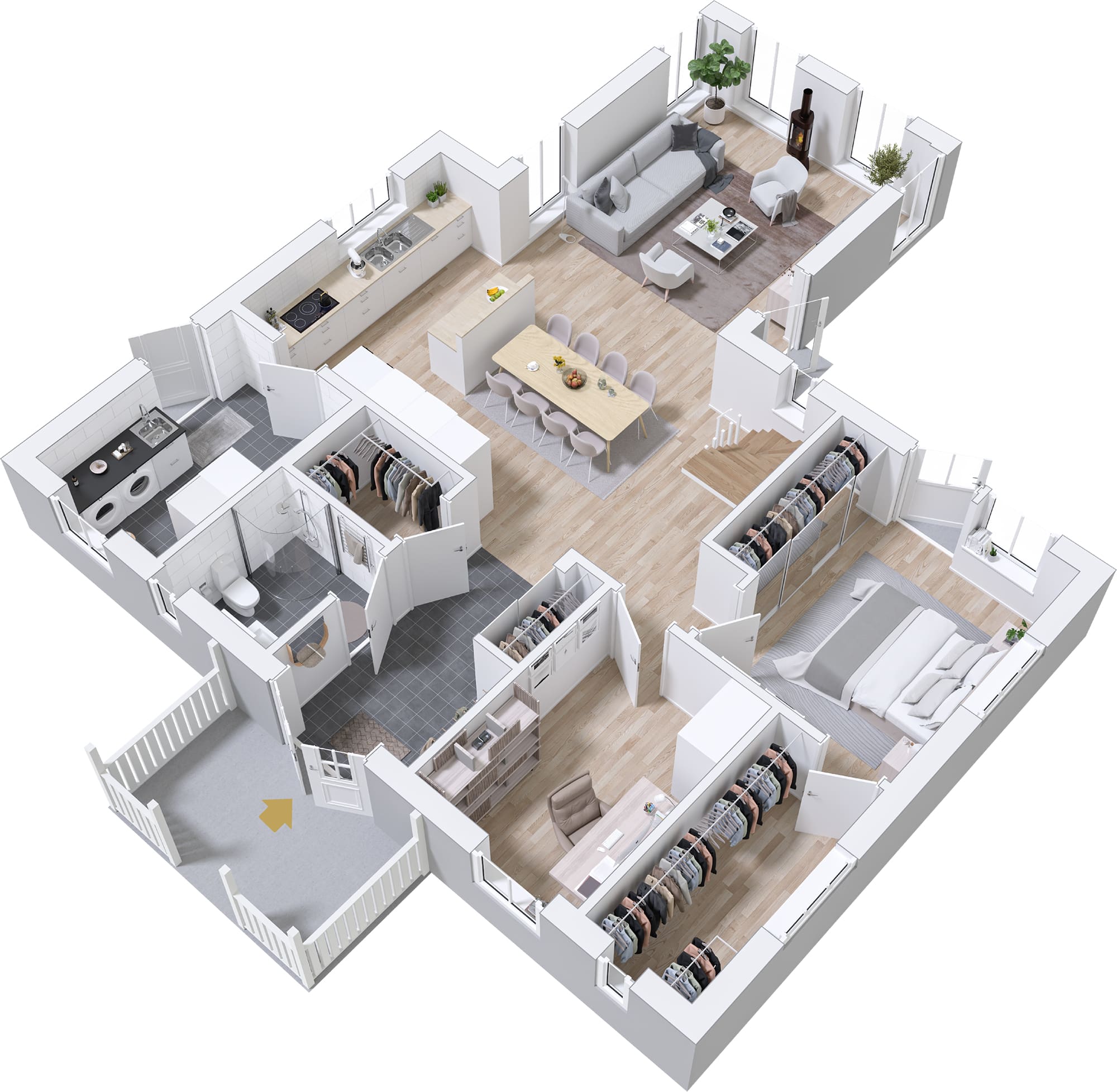 Med Björkhem kommer stora möjligheter. Skapa en lyxig känsla genom att utöka ett av sovrummen med en separat klädkammare. Komplettera med ett extra förråd under trappan för bättre förvaring. Vill du göra mer själv? Välj leverans med oinredd övervåning.