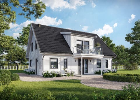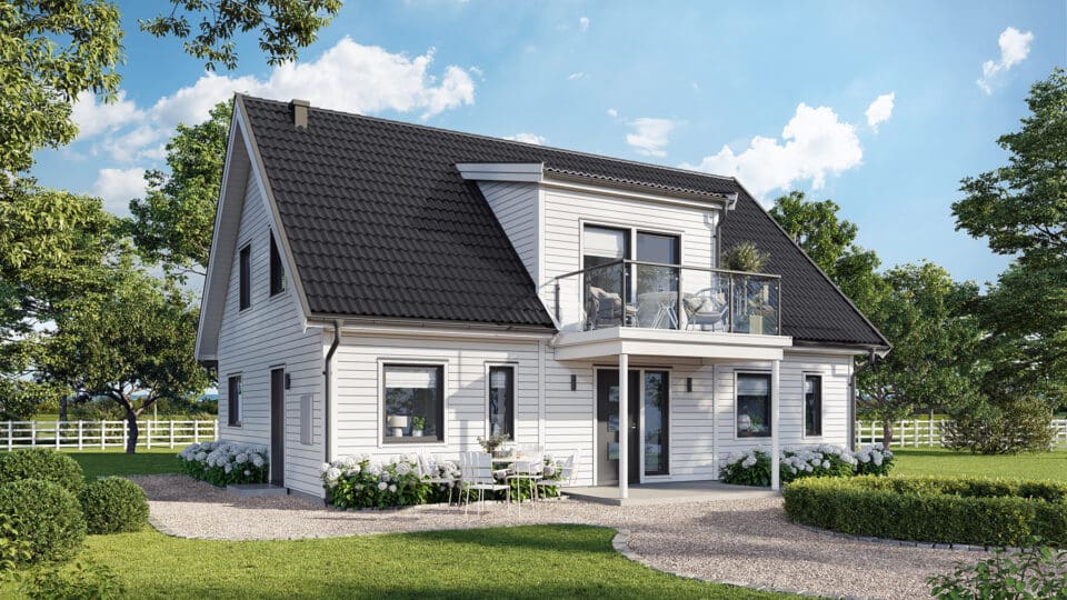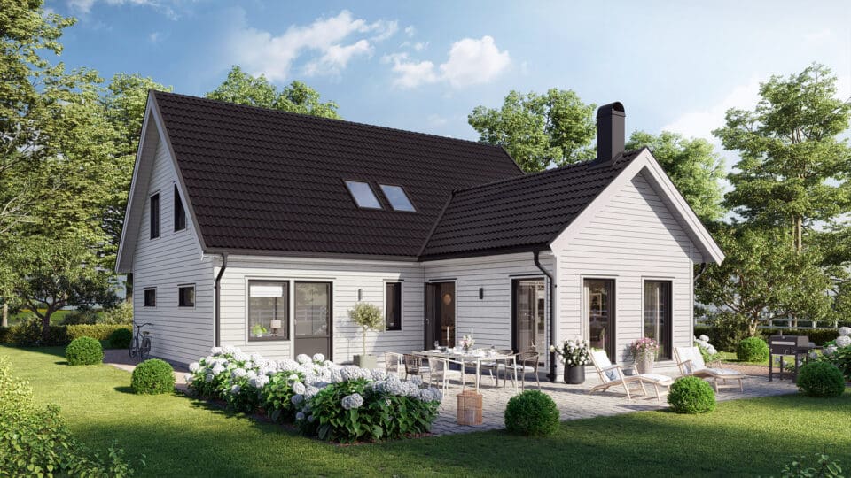 Med 28 mm tjocklek på foder, knutar och vindskivor är detta ett trähus som står pall. De flesta av våra kunder väljer fasad i trä men vi bygger gärna huset med fasad i puts eller tegel. Kvalitetspannor från Benders är standard för taket. Här finns många val i kvalitet och färg. Väljer du träfasad är huset grundmålat från fabrik som standard.