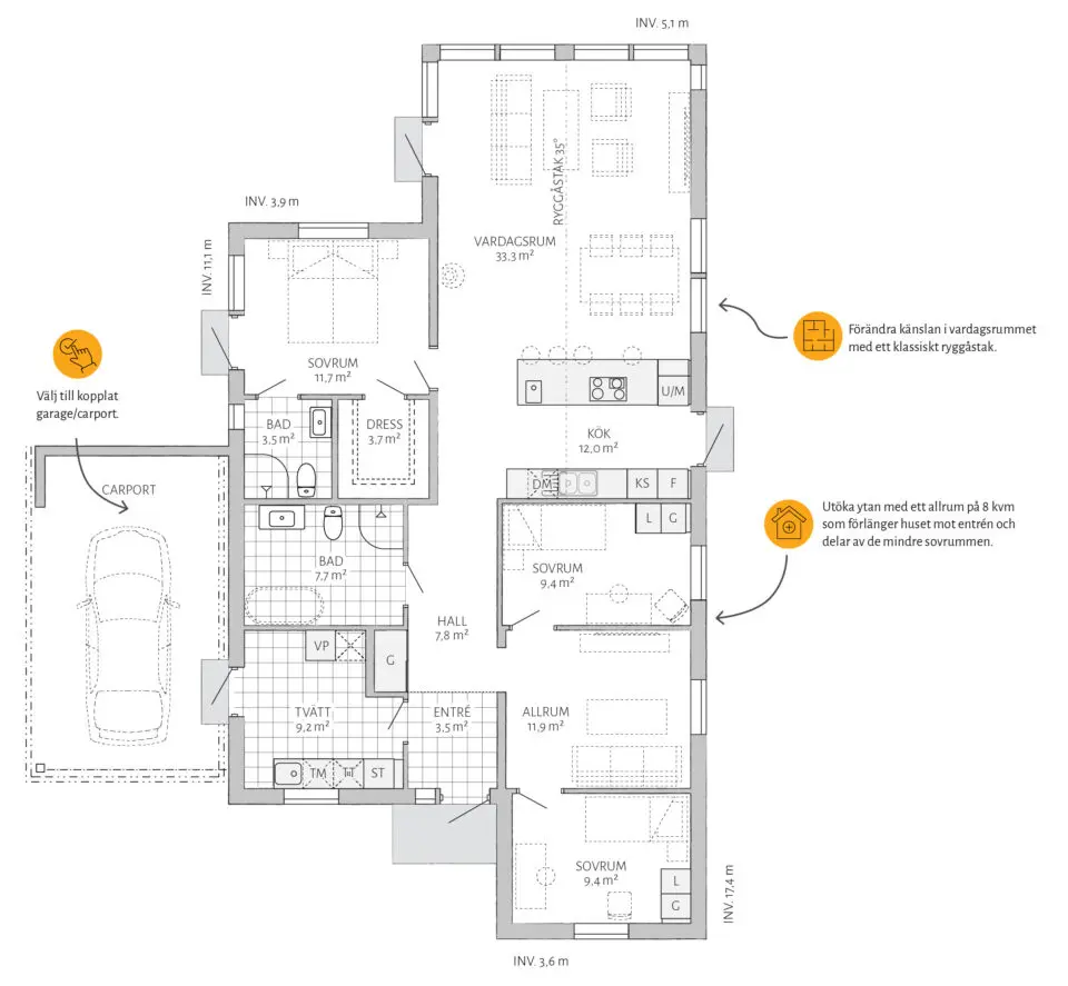Fagerhem är lätt att anpassa. Utöka huset mot entrén med ett allrum vid de mindre sovrummen, ett perfekt lekrum för de mindre barnen eller social yta för de större. Ett ryggåstak ger en större upplevelse av rymd i vardagsrummet och ett kopplat garage/carport bidrar med extra förvaring.