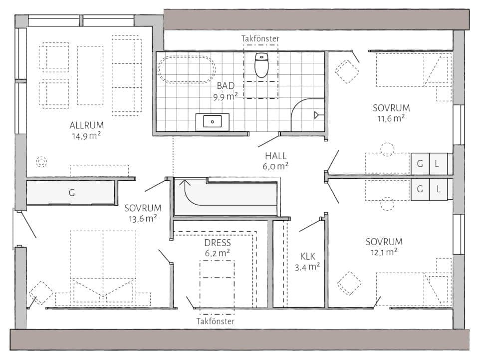 Detta 1 1/2-planshus är som hämtat direkt ur en storstad. Den tydliga entrén känns välkomnande och väl inne bjuder huset på smart förvaring med både skjutdörrsgarderober och klädkammare.