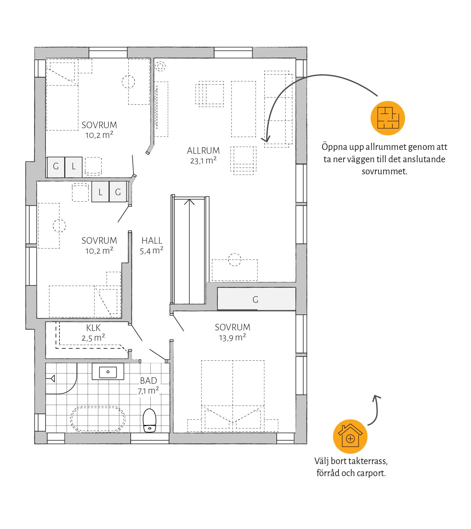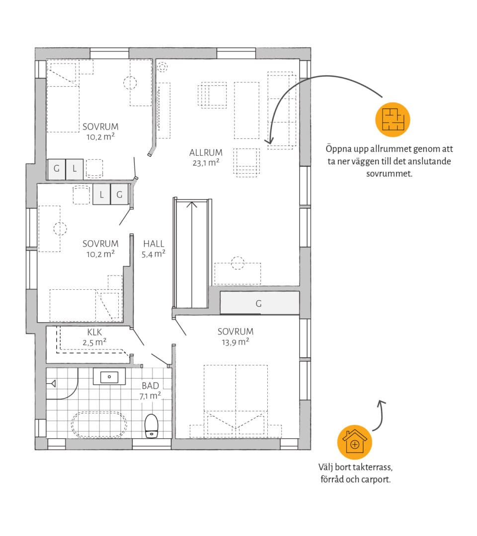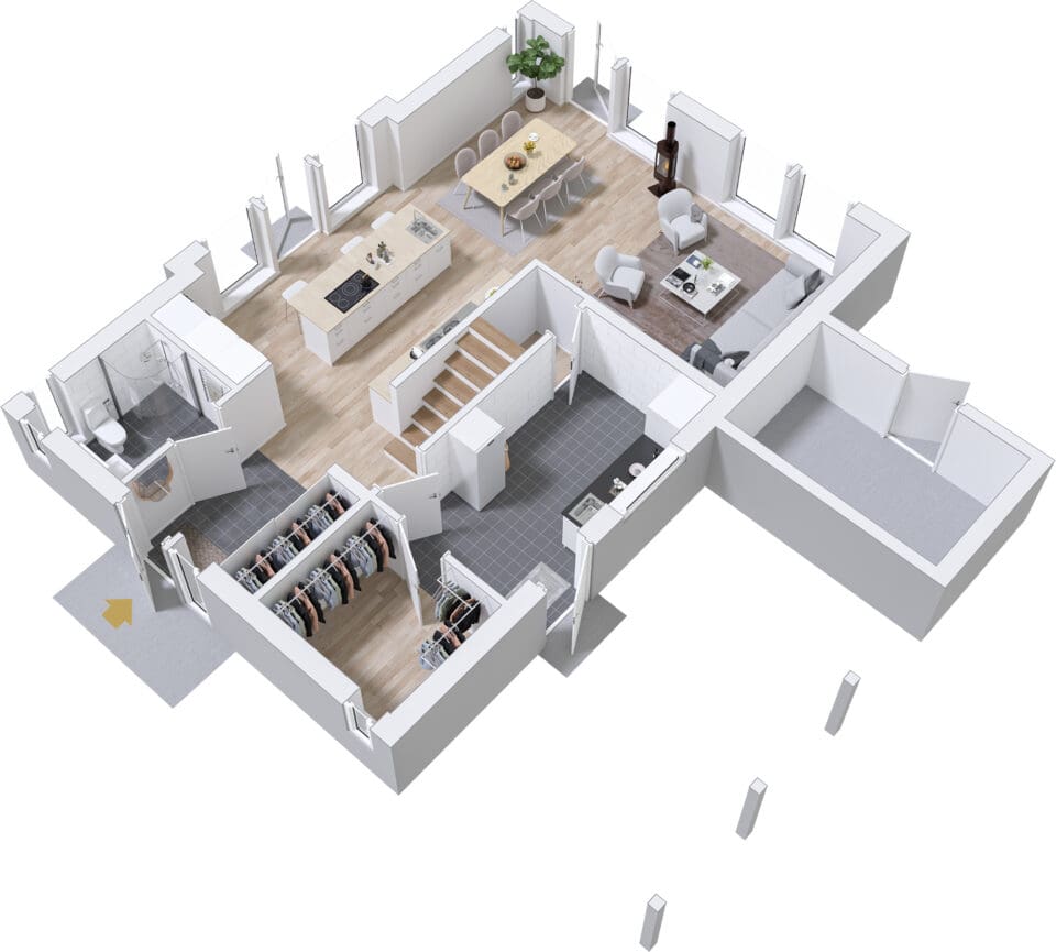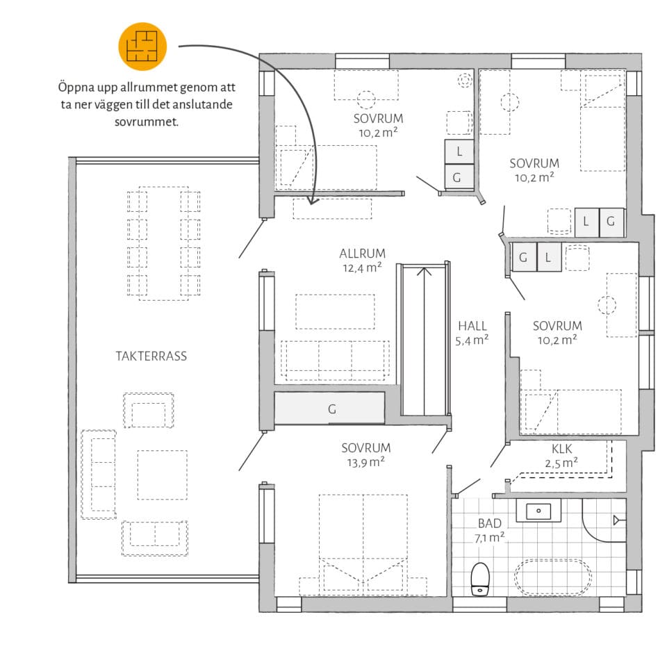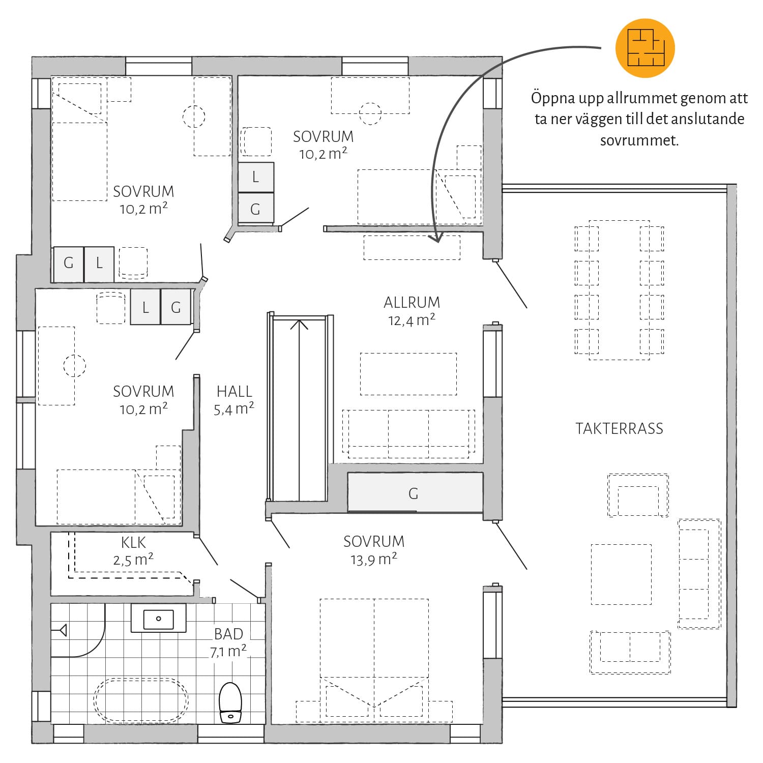 Ljunghem är lätt att anpassa efter dina behov. Varför inte öppna upp allrummet i anslutning till den härliga terrassen för större sociala ytor? På entrévåningen kan klädkammaren enkelt konverteras till ett praktiskt arbetsrum.