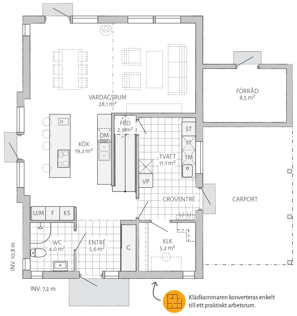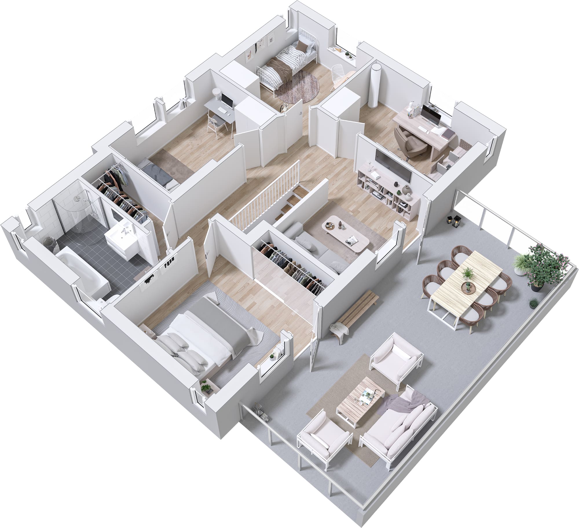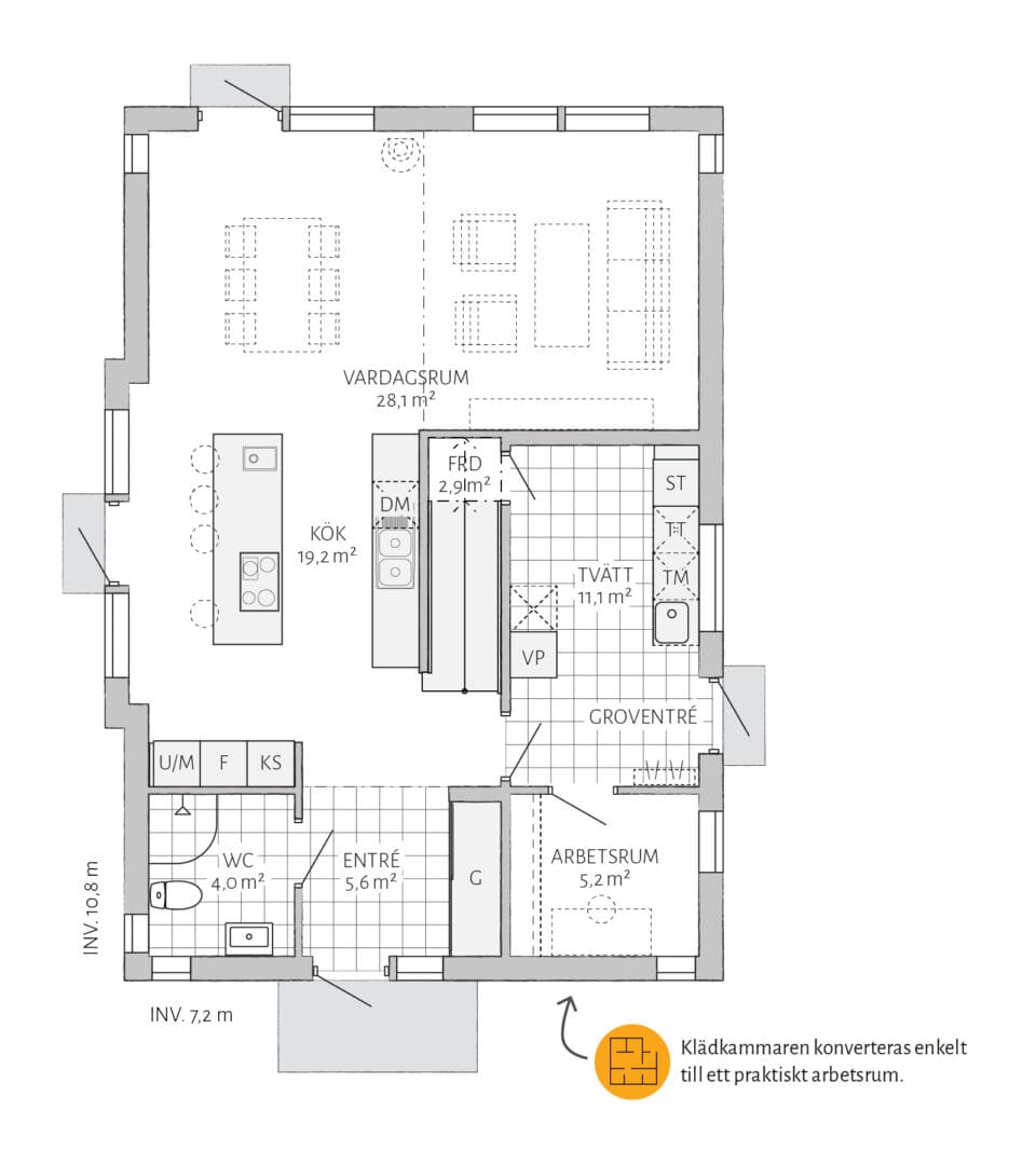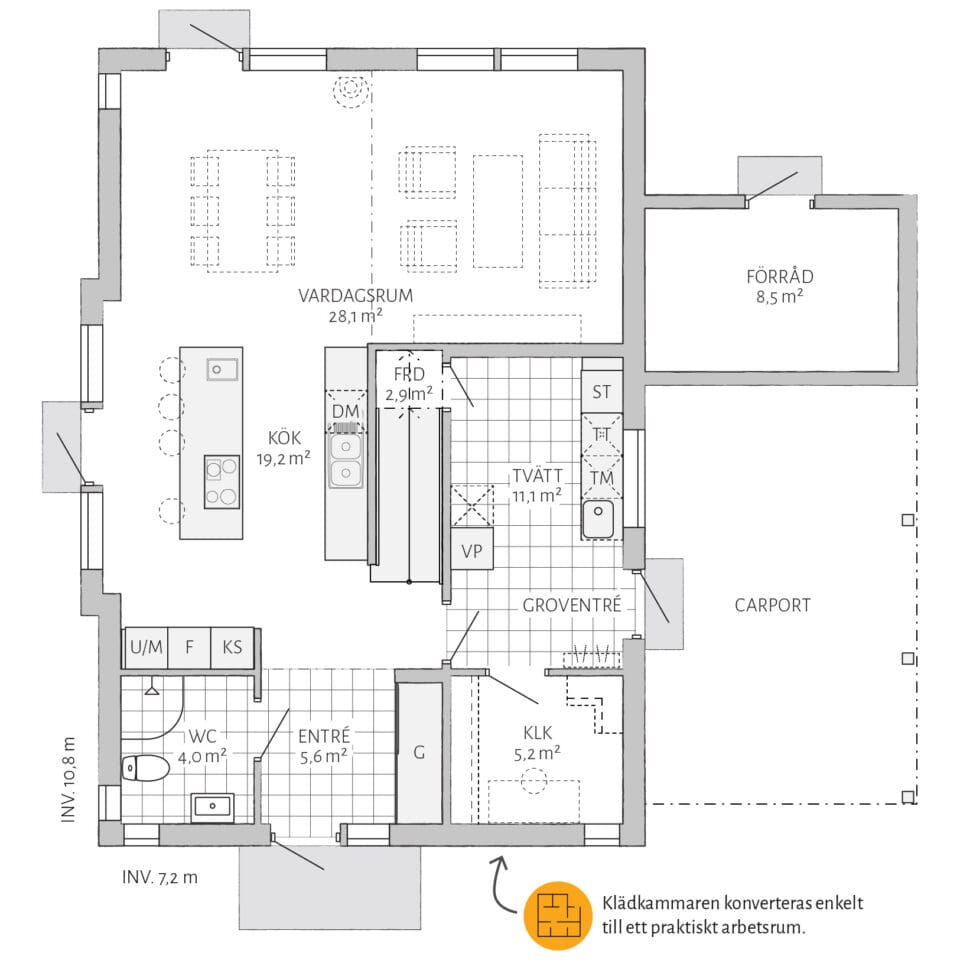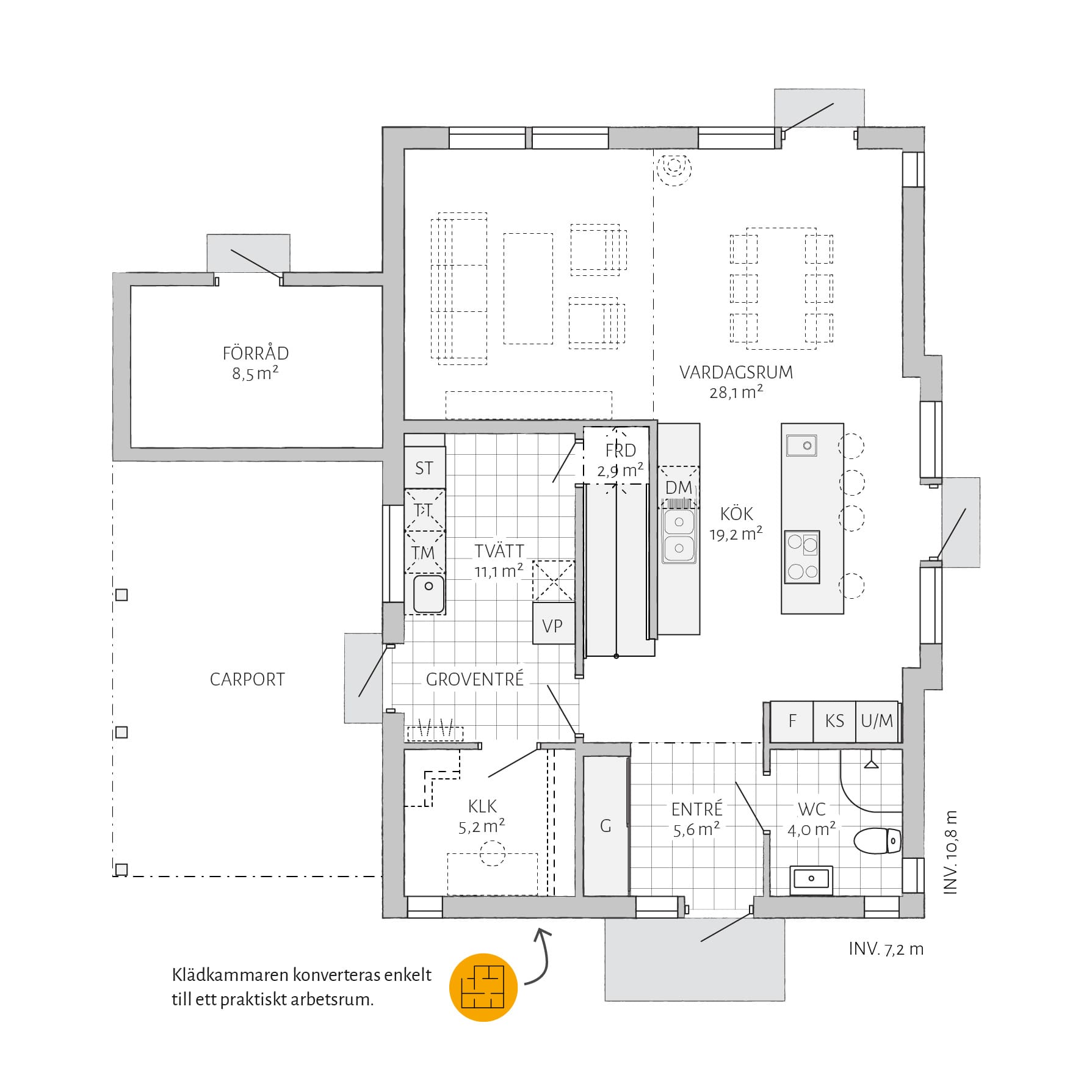 Ljunghem är lätt att anpassa efter dina behov. Varför inte öppna upp allrummet i anslutning till den härliga terrassen för större sociala ytor? På entrévåningen kan klädkammaren enkelt konverteras till ett praktiskt arbetsrum.
