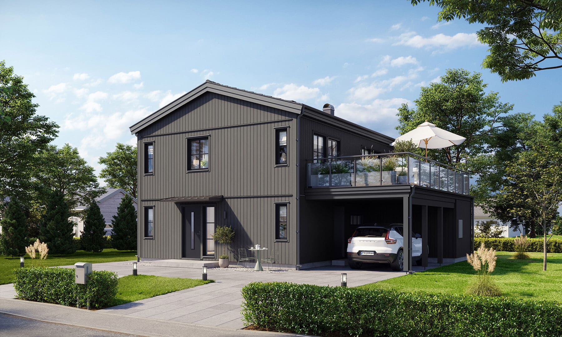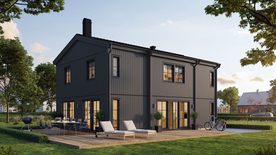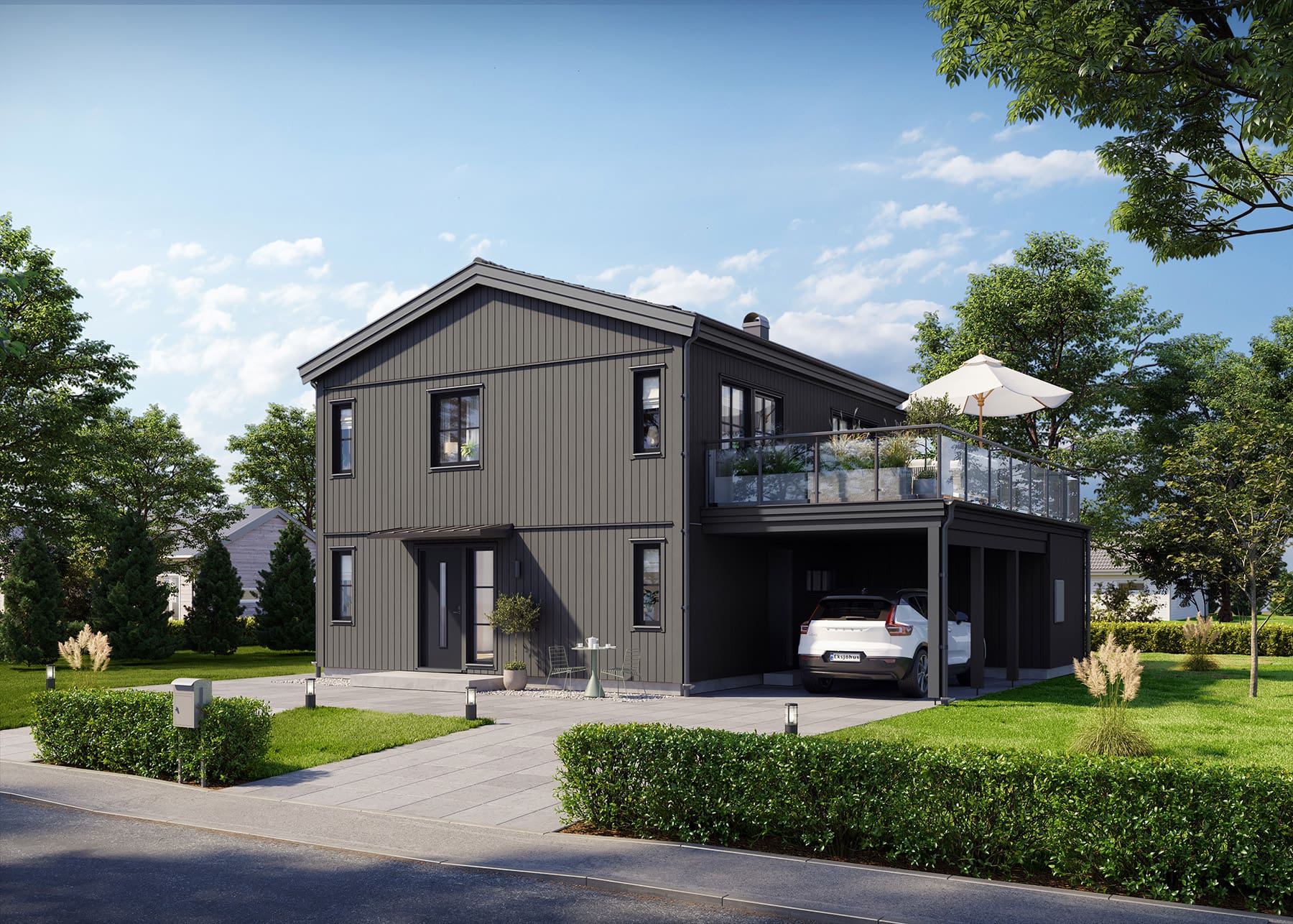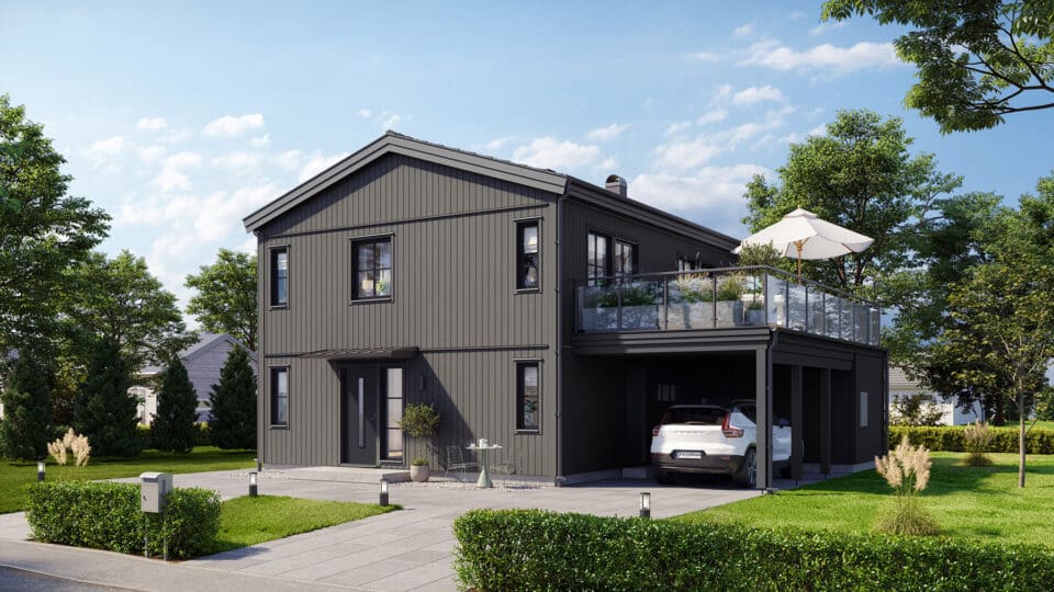 Med 28 mm tjocklek på foder, knutar och vindskivor är detta ett trähus som står pall. De flesta av våra kunder väljer fasad i trä men vi bygger gärna huset med fasad i puts eller tegel. Kvalitetspannor från Benders är standard för taket. Här finns många val i kvalitet och färg. Väljer du träfasad är huset grundmålat från fabrik som standard.