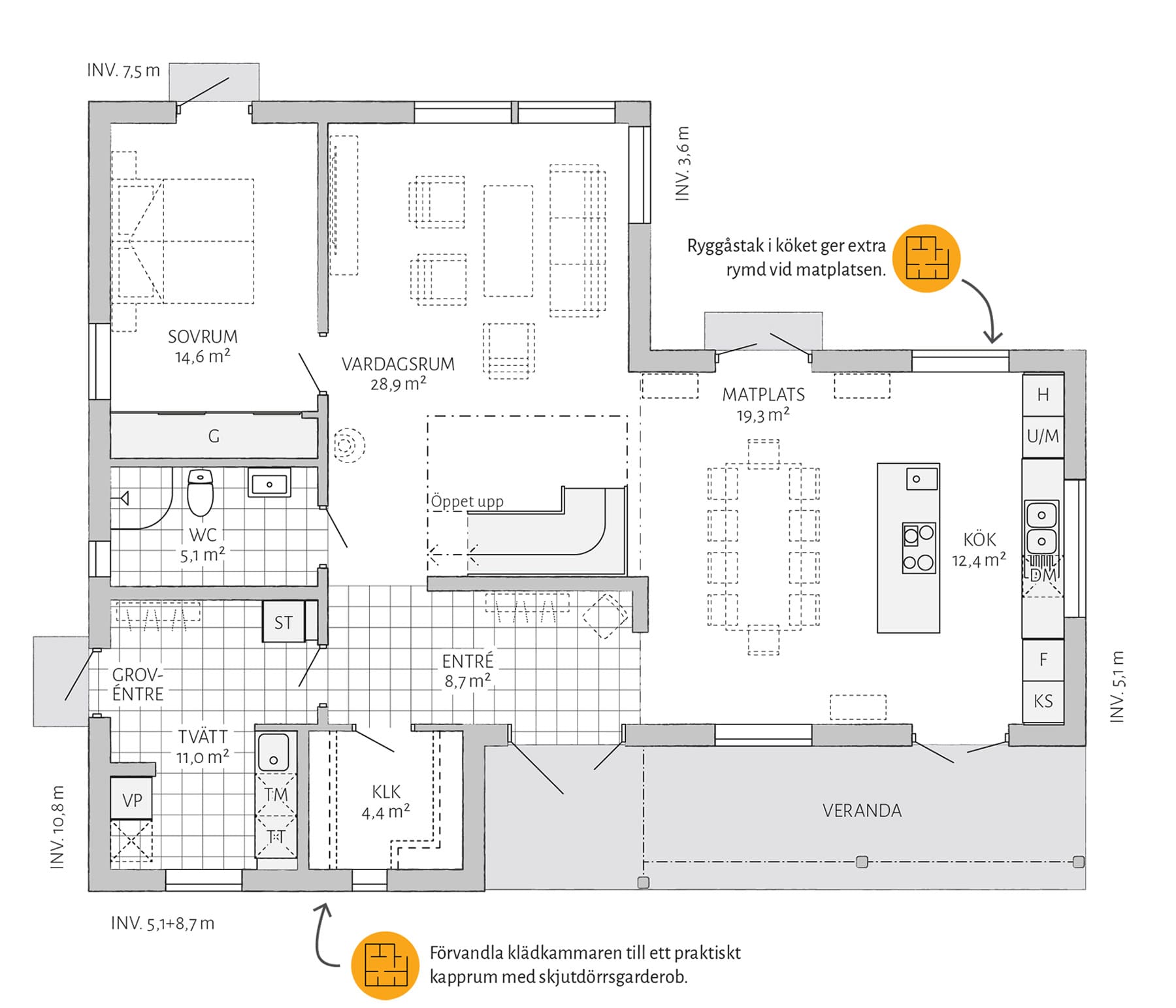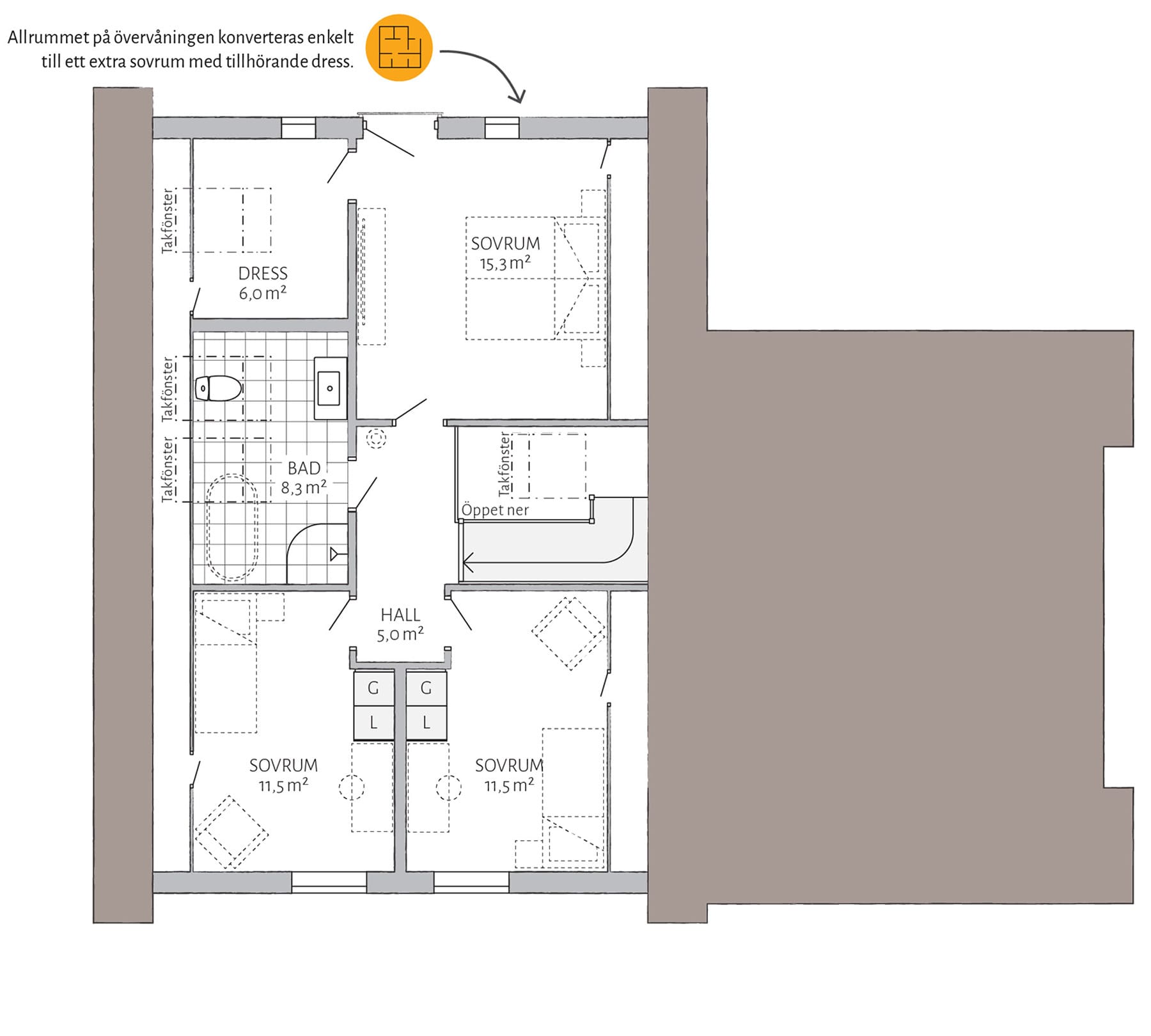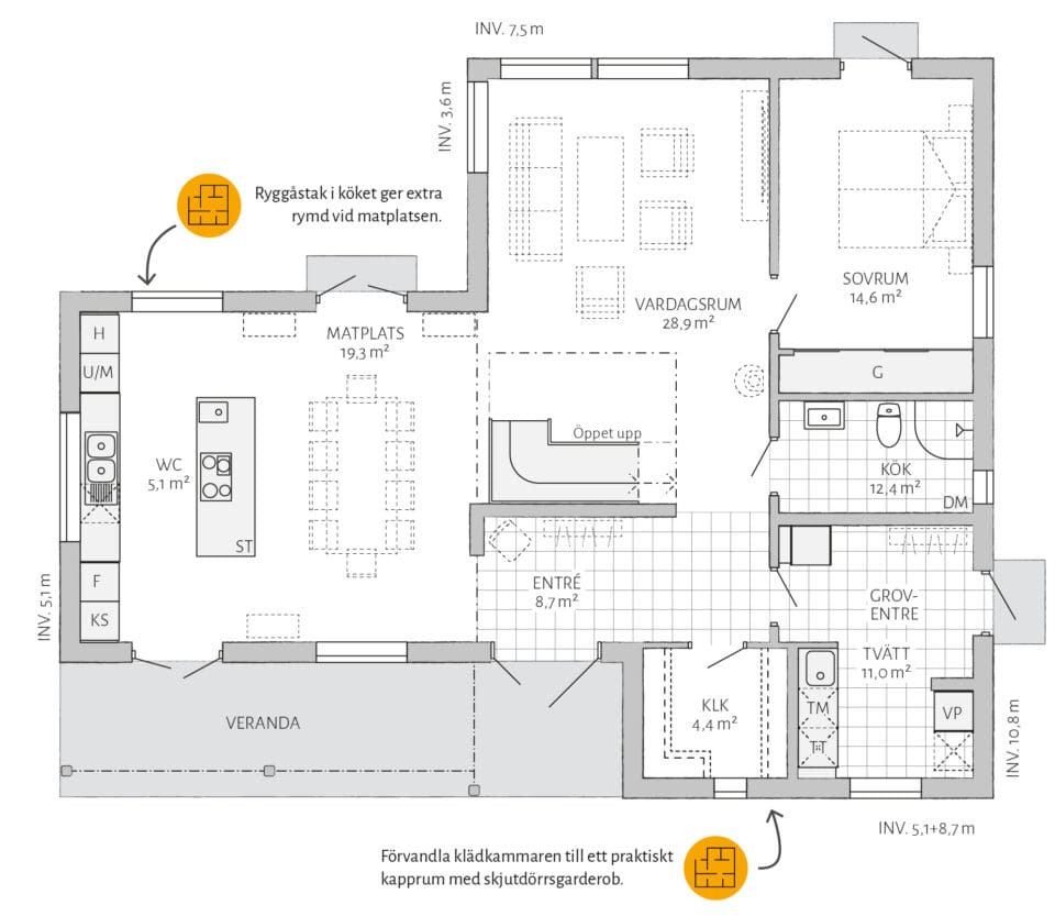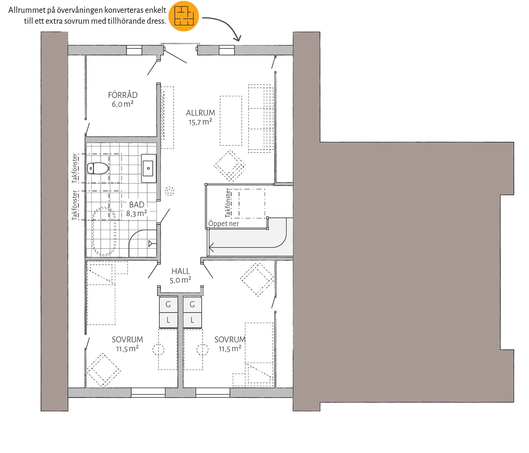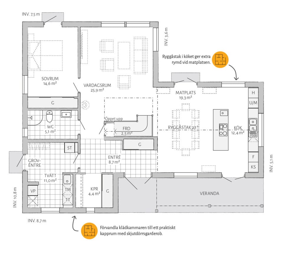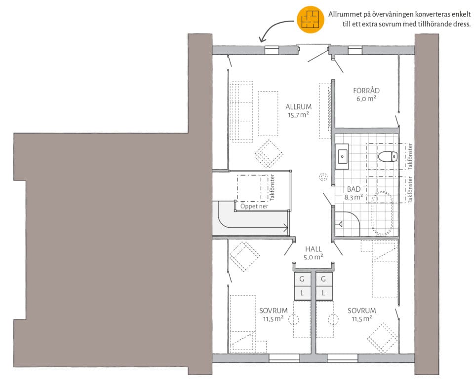 Lyckhem har möjligheter! Välj ryggåstak i köket och upplev en fantastiskt rymd som sträcker sig vidare ut i vardagsrummet. Gör allrummet till ett extra sovrum och komplettera med en walk-in-closet eller arbetsrum i anslutning. Vill du göra mer själv? Välj leverans med oinredd övervåning.
