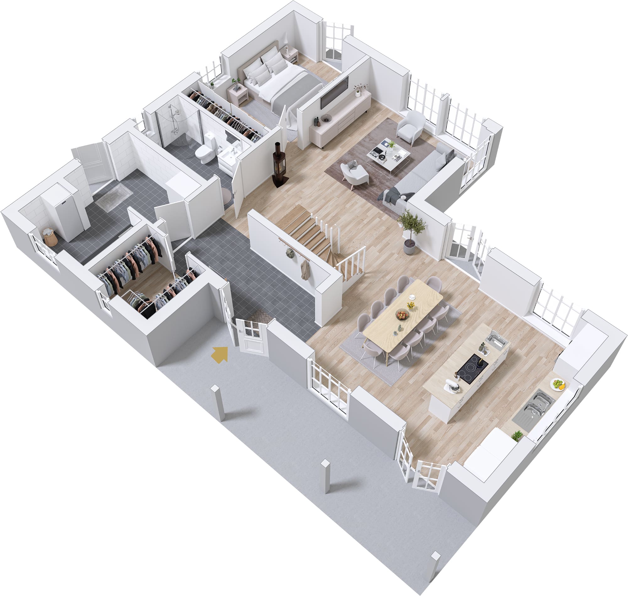 Vår standardutrustning är komplett och av högsta kvalitet. Huset har berg-, jord-, frånluft- eller sjövärmepump från Nibe. Badrums- och köksinredning från Vedum, samt vitvaror till kök och tvätt från Miele. Vi kompromissar inte med att bygga trähus, därför är massiv ektrappa från Snickarlaget, trägolv från Kährs och massiva innerdörrar från Swedoor standard. Vill du uppgradera ytterligare finns många attraktiva val.