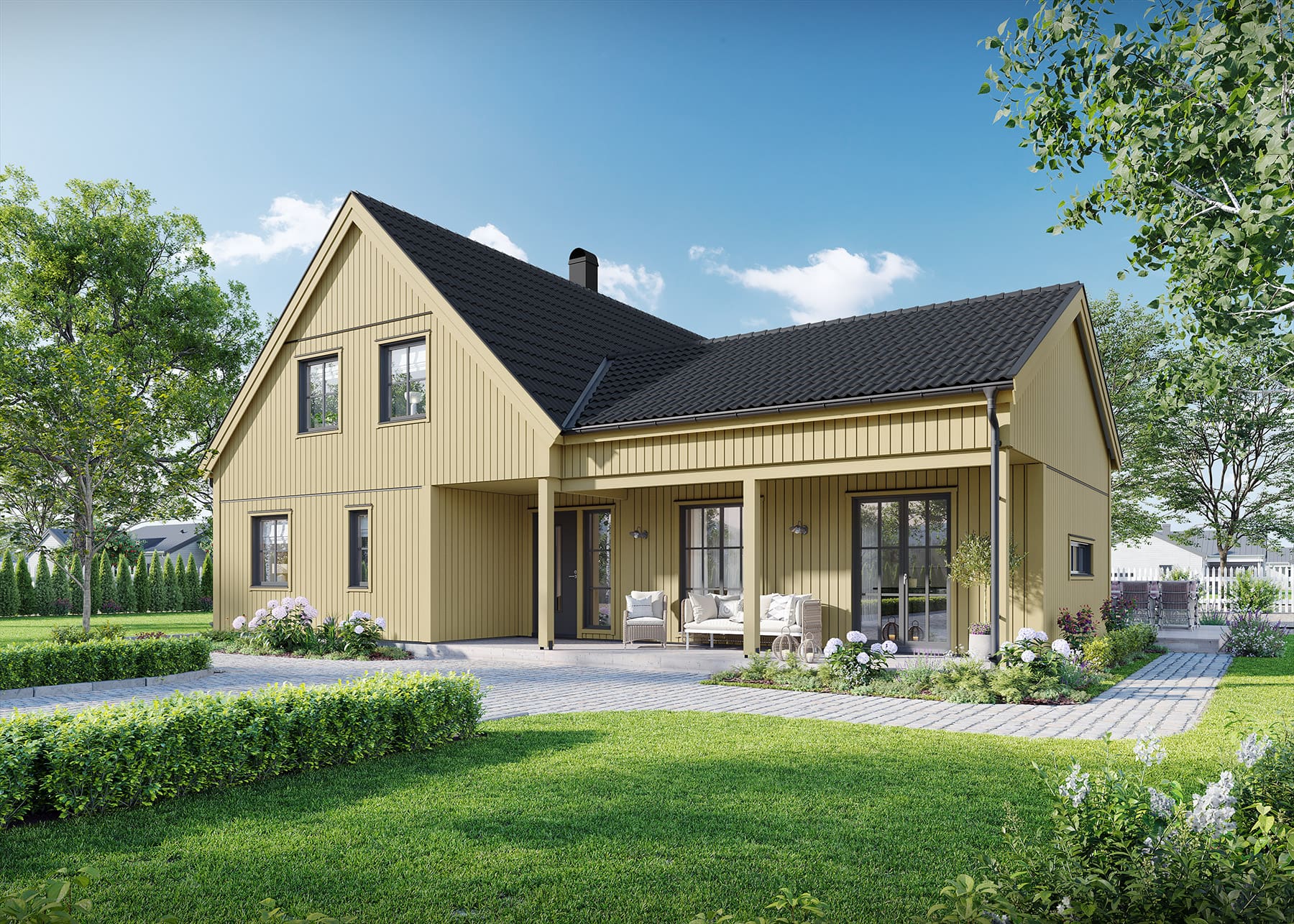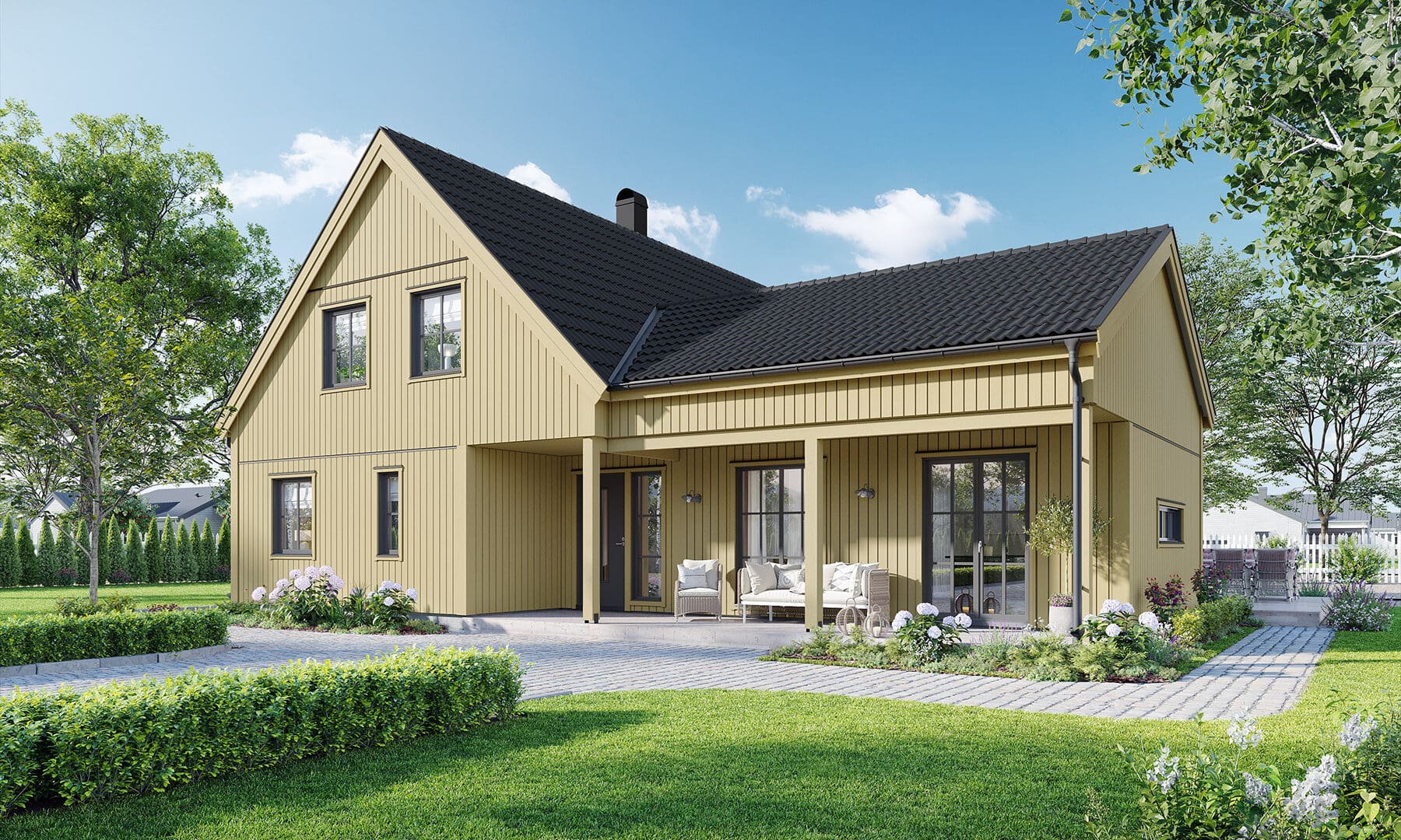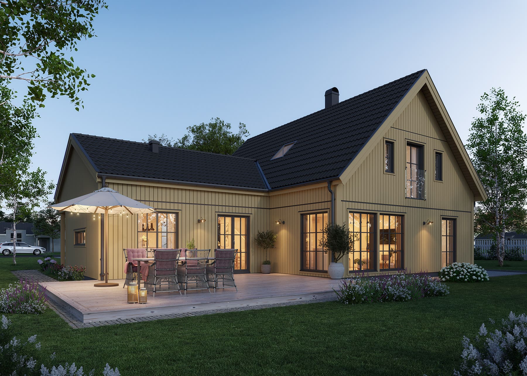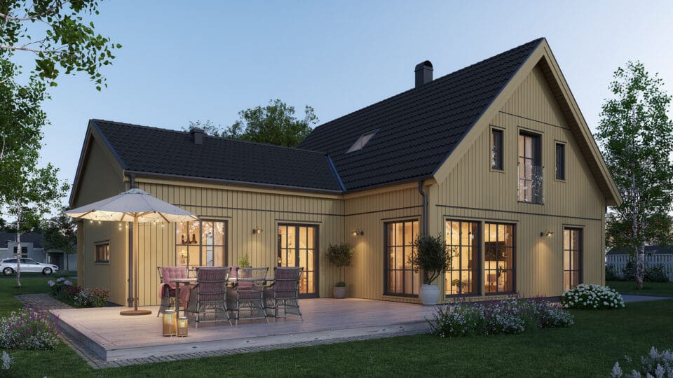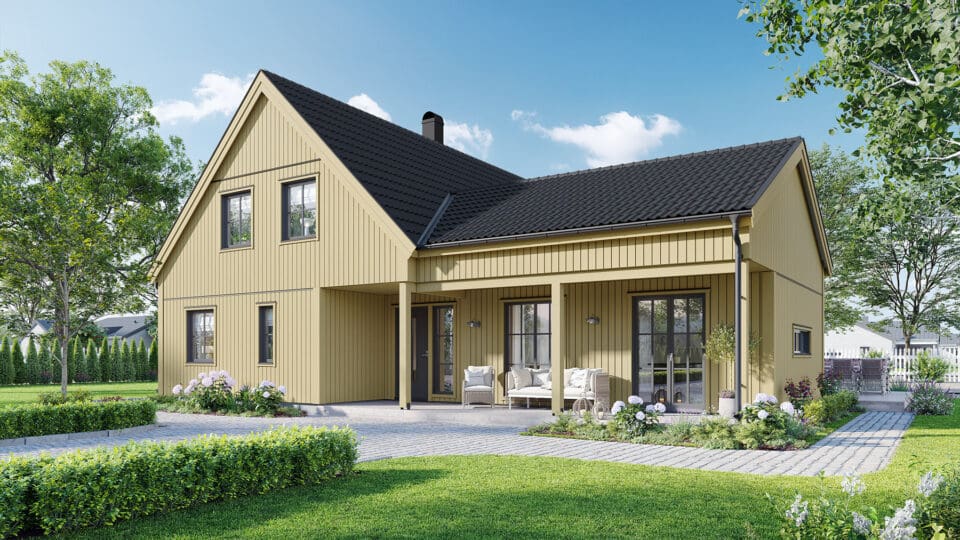 I Lyckhem Industriell är utemiljön ständigt närvarande tack vare de många fönsterdörrarna, oavsett om du vill kliva ut i grönskan från sovrummet eller njuta av morgonkaffet på den charmiga verandan. Lyckhem Industriell ger New England-stilen en touch av ladhus och anpassar den till ett modernt familjeliv, med sociala ytor, 3 sovrum och gott om förvaring tack vare husets 1,5-plan.