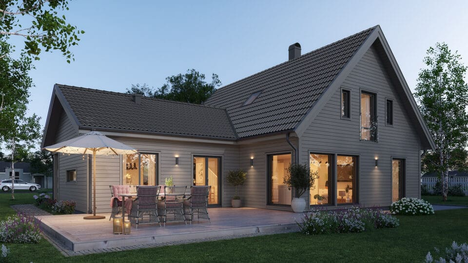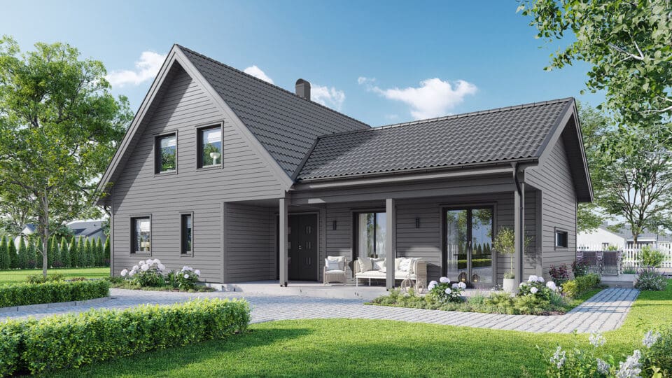 Med 28 mm tjocklek på foder, knutar och vindskivor är detta ett trähus som står pall. De flesta av våra kunder väljer fasad i trä men vi bygger gärna huset med fasad i puts eller tegel. Kvalitetspannor från Benders är standard för taket. Här finns många val i kvalitet och färg. Väljer du träfasad är huset grundmålat från fabrik som standard.