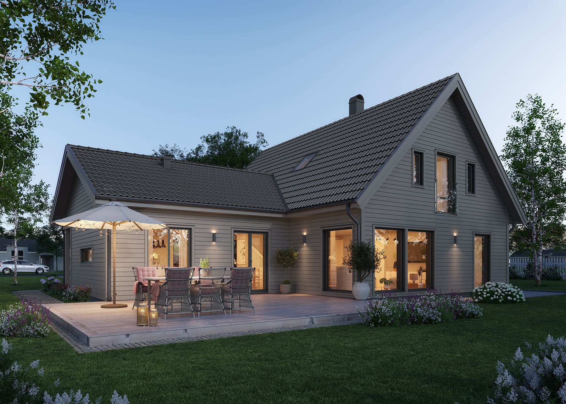 Lyckhem Modern gör utemiljön ständigt närvarande tack vare de många och helglasade fönsterdörrarna. Här är det lätt att kliva ut i grönskan eller till den charmiga verandan för att njuta av morgonkaffet. Lyckhem Modern ger New England-stilen en modern touch och anpassar den till ett modernt familjeliv, med sociala ytor, 3 sovrum och gott om förvaring tack vare husets 1,5-plan.
