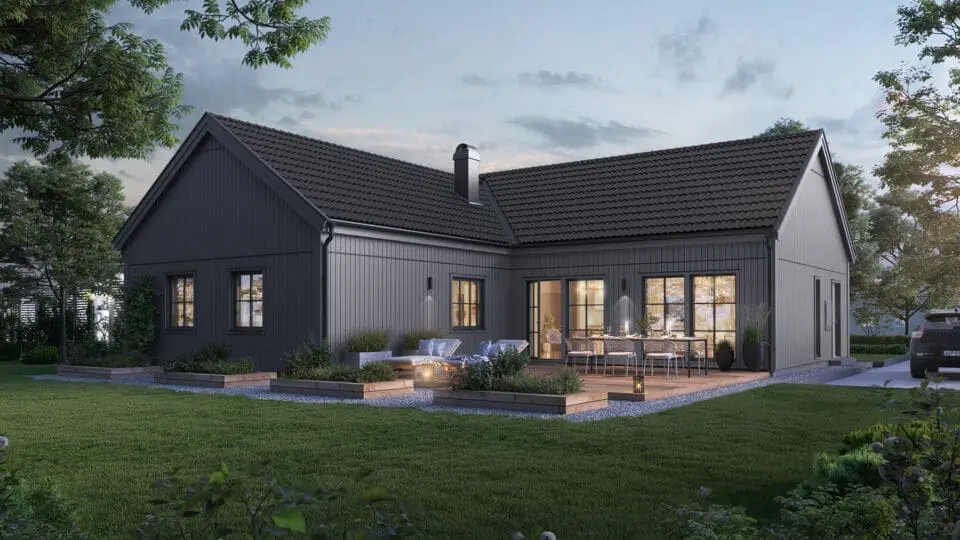 Strama detaljer och smal takfot ger stor karaktär till Prio 141 Industriell. Med ett formspråk som leder tankarna till konstnärsateljéer och ladhus passar det lika bra på landet som i staden. Prio 141 är ett vinkelhus där alla ytor kan användas. Upplev den härliga känslan som skapas i ytorna mellan kök och vardagsrum och hur husets vinkel ger en skyddad och trivsam uteplats på baksidan. Med tvättstuga, flera sovrum och gott om förvaring finns det plats för allt som barnfamiljen behöver.