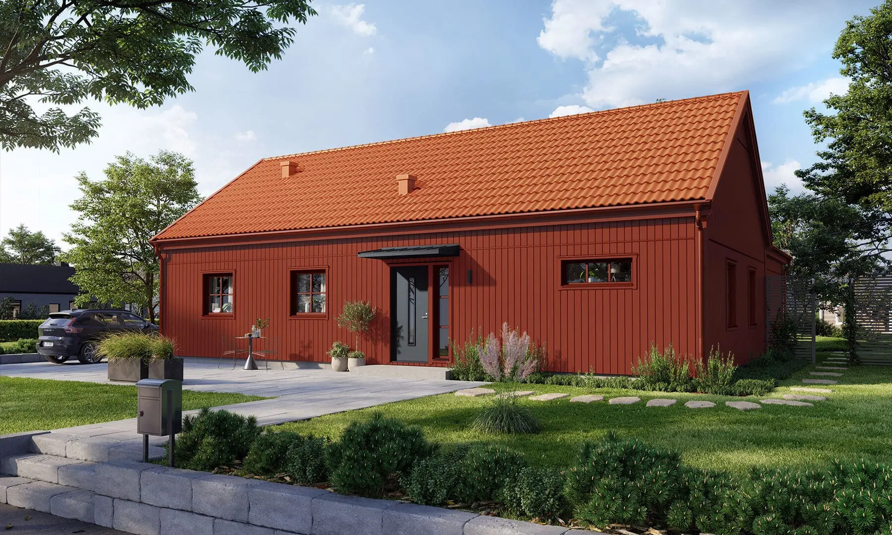 Med 28 mm tjocklek på foder, knutar och vindskivor är detta ett trähus som står pall. De flesta av våra kunder väljer fasad i trä men vi bygger gärna huset med fasad i puts eller tegel. Kvalitetspannor från Benders är standard för taket. Här finns många val i kvalitet och färg. Väljer du träfasad är huset grundmålat från fabrik som standard.