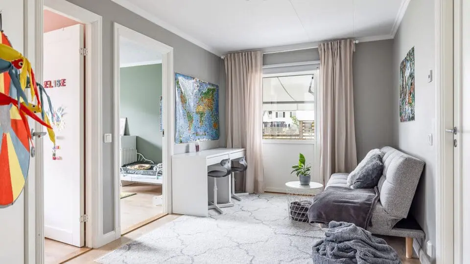 Vardagsrum och kök är centralt placerade och den sammanlagda ytan är totalt 59,2 kvadratmeter. Så här får både familj, vänner och släkt plats att umgås. Husets fyra sovrum är uppdelade i två delar, en för vuxna och en för barn eller ungdomar på varsin sida av vardagsrummet och köket. Om leksakerna patrullerar in mot vardagsrummet kan du snabbt stänga till en dörr mot barnens sovrum samt deras eget allrum och egen wc. I föräldradelen är badrummet ”ensuite”, vilket känns lyxigt och skönt.