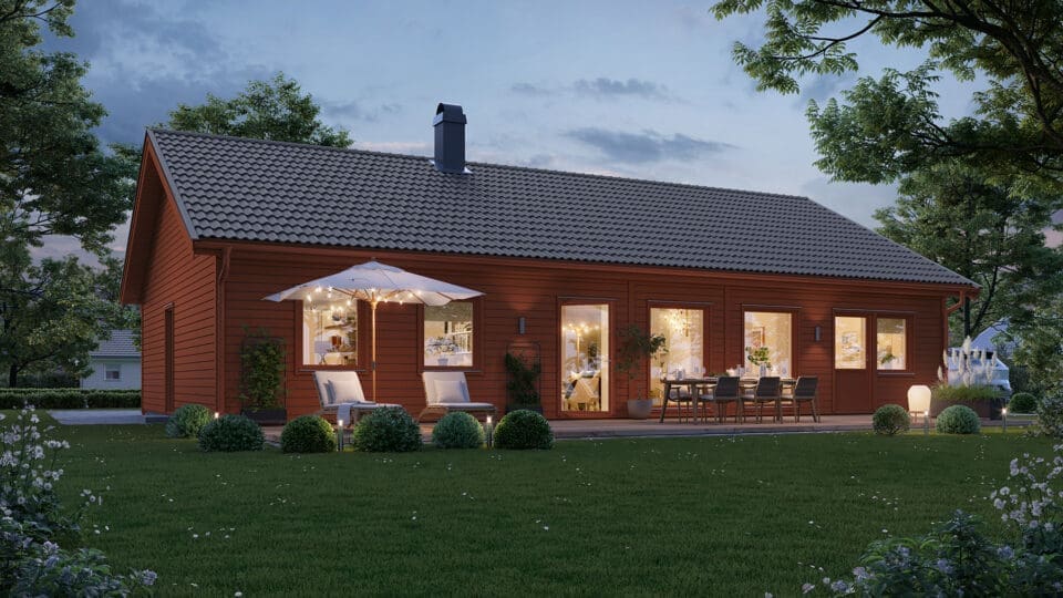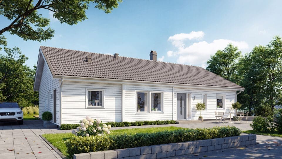 Med 28 mm tjocklek på foder, knutar och vindskivor är detta ett trähus som står pall. De flesta av våra kunder väljer fasad i trä men vi bygger gärna huset med fasad i puts eller tegel. Kvalitetspannor från Benders är standard för taket. Här finns många val i kvalitet och färg. Väljer du träfasad är huset grundmålat från fabrik som standard.