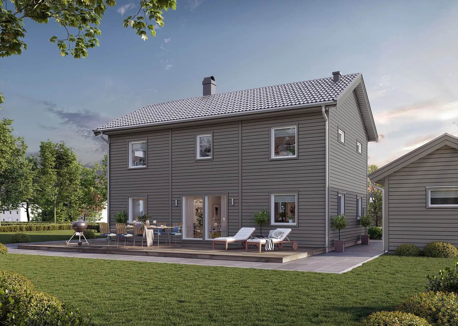Med 28 mm tjocklek på foder, knutar och vindskivor är detta ett trähus som står pall. De flesta av våra kunder väljer fasad i trä men vi bygger gärna huset med fasad i puts eller tegel. Kvalitetspannor från Benders är standard för taket. Här finns många val i kvalitet och färg. Väljer du träfasad är huset grundmålat från fabrik som standard.