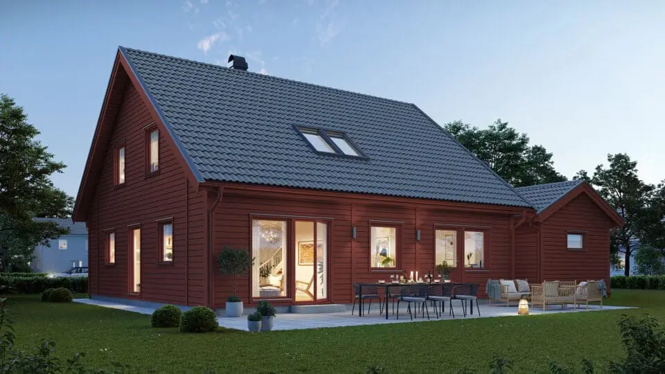Med 28 mm tjocklek på foder, knutar och vindskivor är detta ett trähus som står pall. De flesta av våra kunder väljer fasad i trä men vi bygger gärna huset med fasad i puts eller tegel. Kvalitetspannor från Benders är standard för taket. Här finns många val i kvalitet och färg. Väljer du träfasad är huset grundmålat från fabrik som standard.