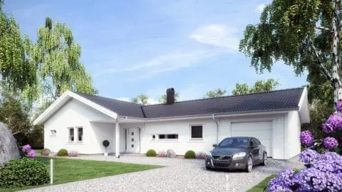– Från början tittade vi både på 1,5-planshus och enplanshus. Men så småningom landade vi ändå i att vi ville ha allt i ett enda plan och slippa trappor. Vi väntade med att välja enplanshusmodell tills vi visste vilken tomt vi skulle få. På det sättet kunde vi skräddarsy huset och planlösningen efter tomtens läge, med väderstrecken, gatan, skogen och så vidare. Den tomt som vi till slut fick ligger jättefint mot en vacker bokskog. Då kändes det naturligt att välja den husmodell som gav mest utsikt mot skogen och ändå ett insynsskyddat läge mot framsidan och gatan.
