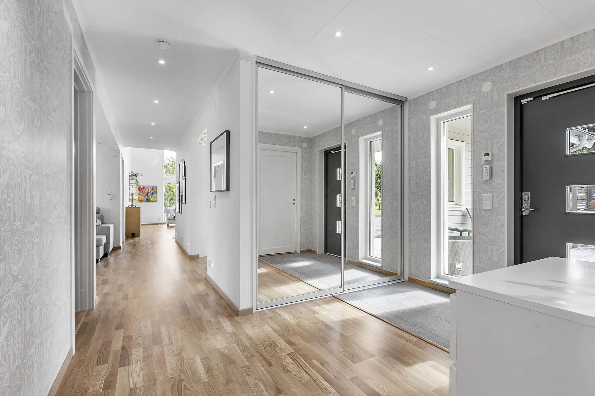 – Vi har satsat på någon enstaka tapet men i övrigt blev det mycket målade väggar. Utvändigt hade vi tänkt ha ett vitt hus, vilket även var vad vi sökte bygglov för, men när modulerna kom grundmålade i grått satt jag och min man i två plaststolar på andra sidan gatan och såg huset växa fram. De kände då att grått vore riktigt snyggt. De åkte runt och tittade på massor av grå hus för att hitta rätt nyans, något de ägnade mycket tid åt. De ringde till och med på för att fråga om färgkoder.