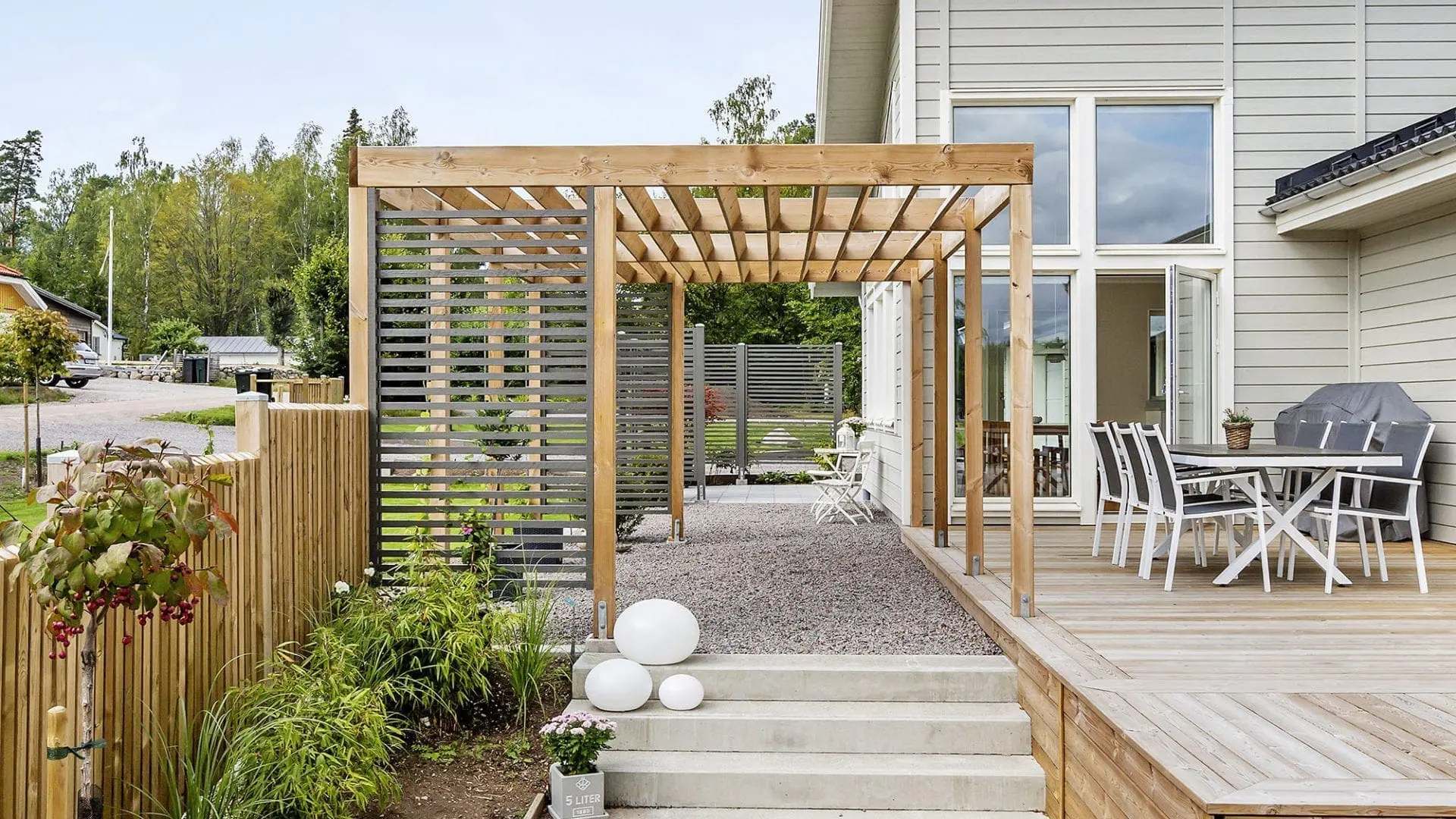 Utmaningen när de väl skövlat skogen var dock att tomten sluttade rätt rejält, med fyra meter i höjdskillnad på diagonalen så det innebär en tomt med många nivåer. När de väl skulle välja husmodell så kände de att ett fint hus blir ännu finare med en fin trädgård – så innan de sökte bygglov anlitade de en trädgårdsdesigner.