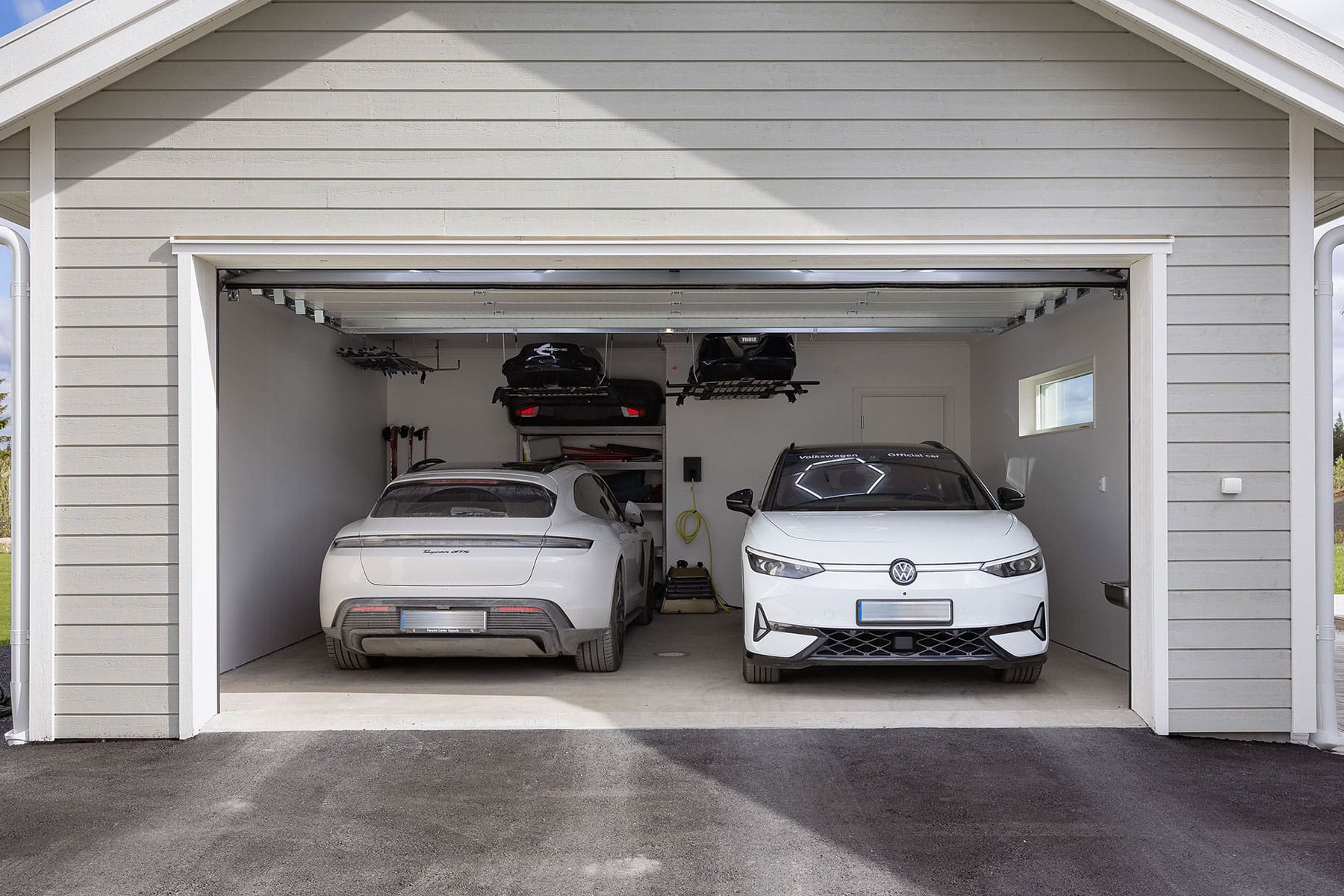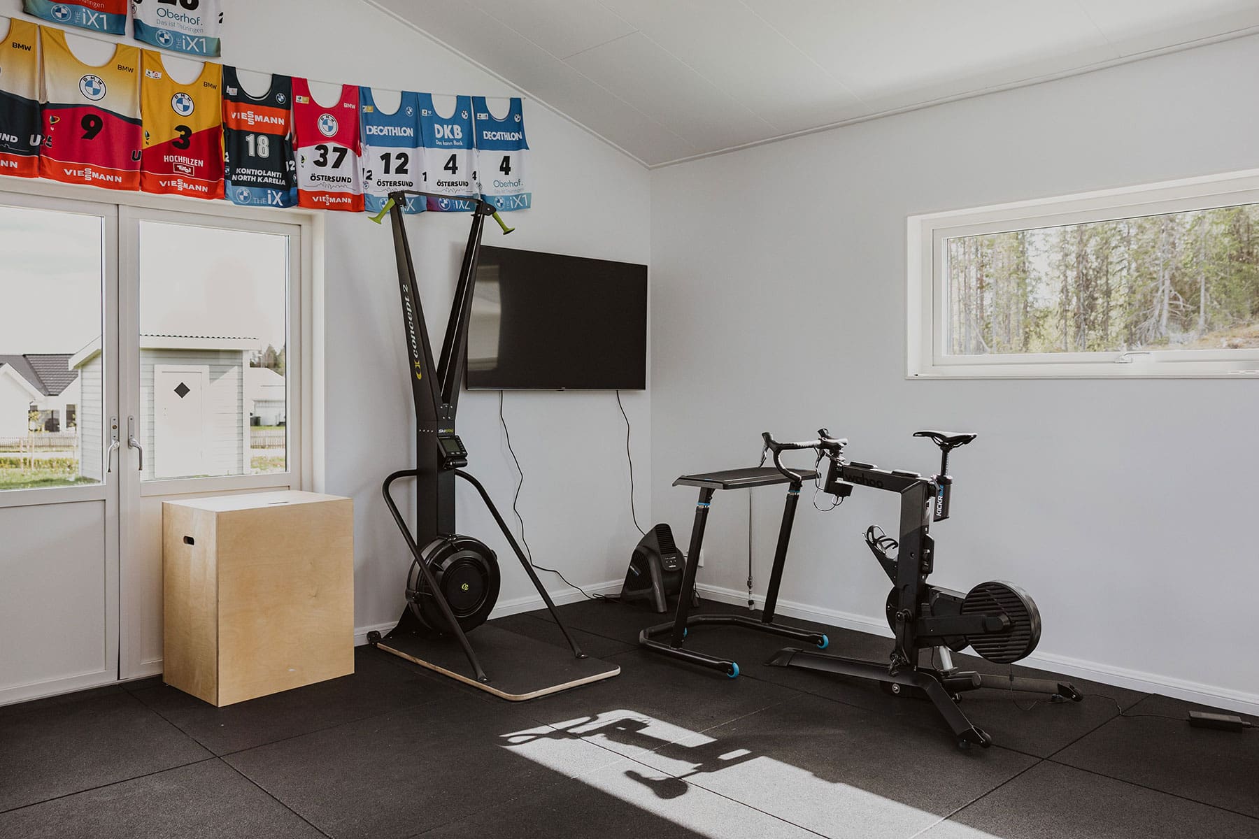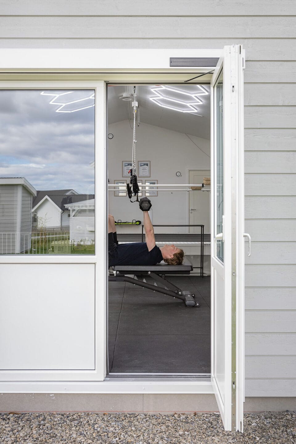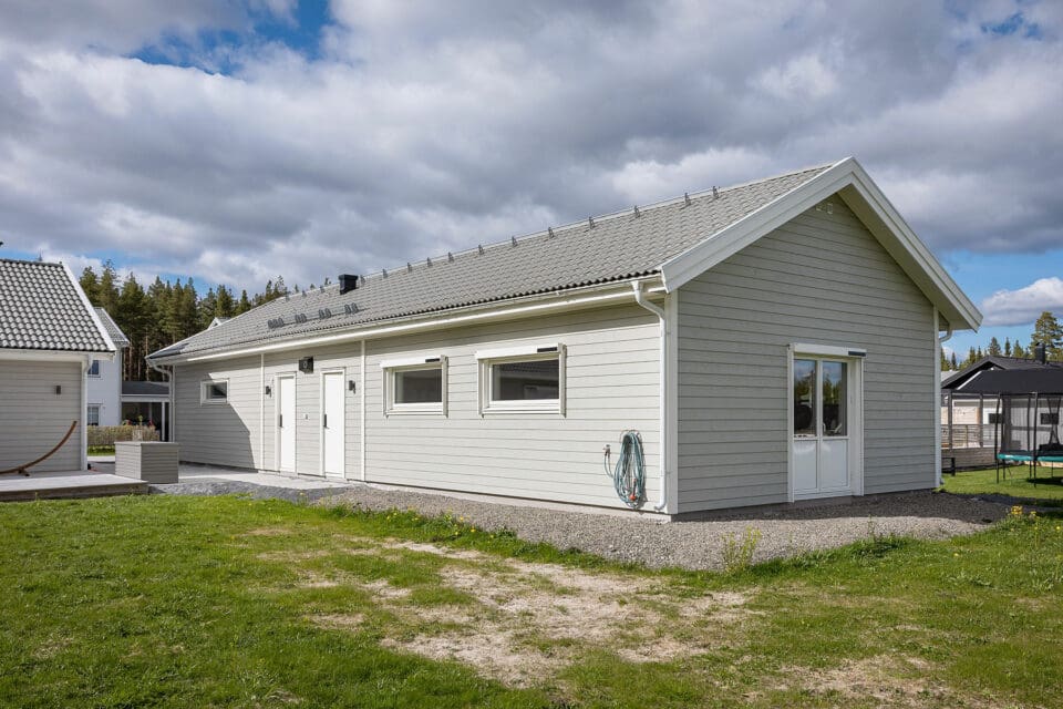 Och lösningen? Sveriges bästa skidgym och ett garage på 117 kvadrat med plats för två elbilar, bastu, badrum, träningsredskap, extra ventilation och eget värmesystem. För att rymma bandet behövdes en takhöjd på 3.60 och en hel del planering.