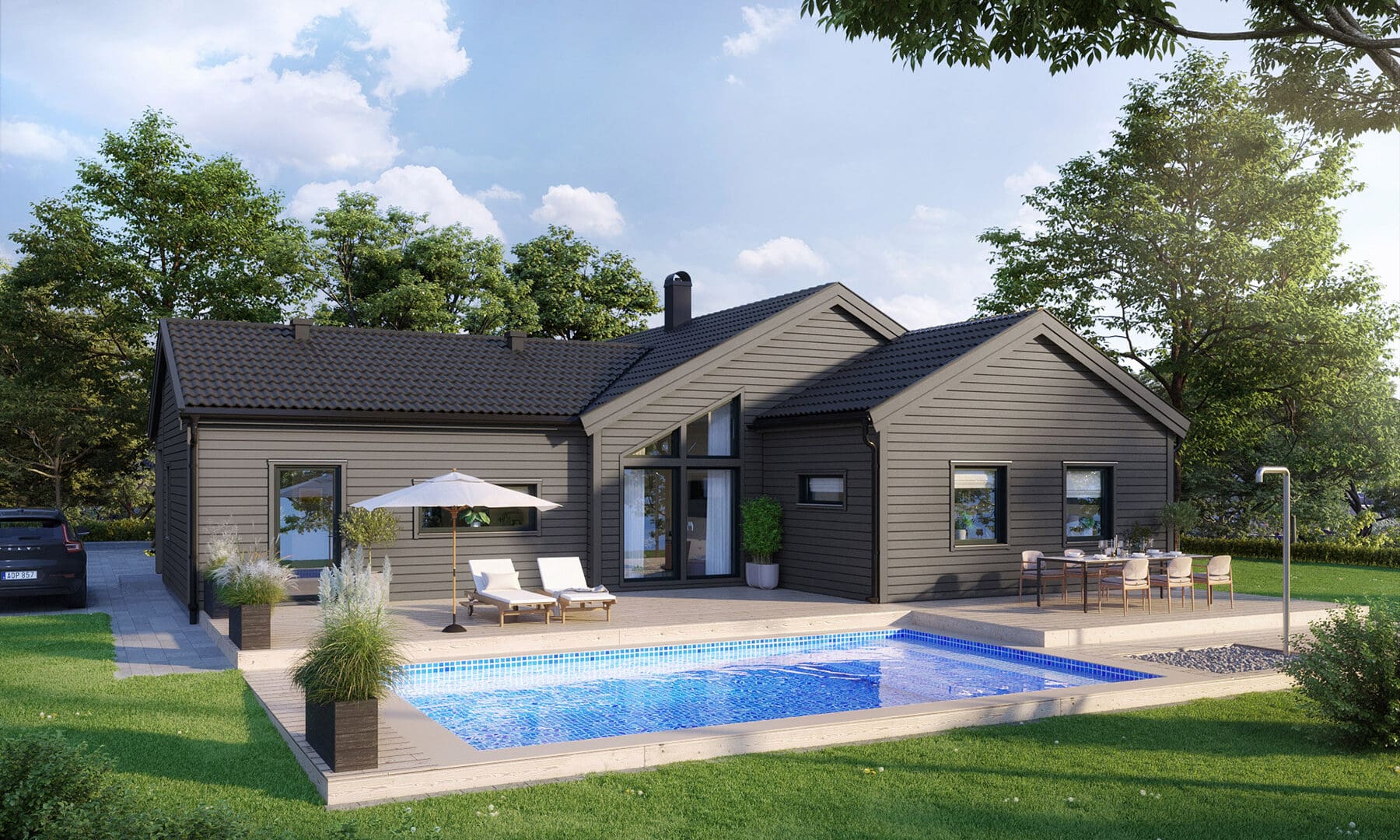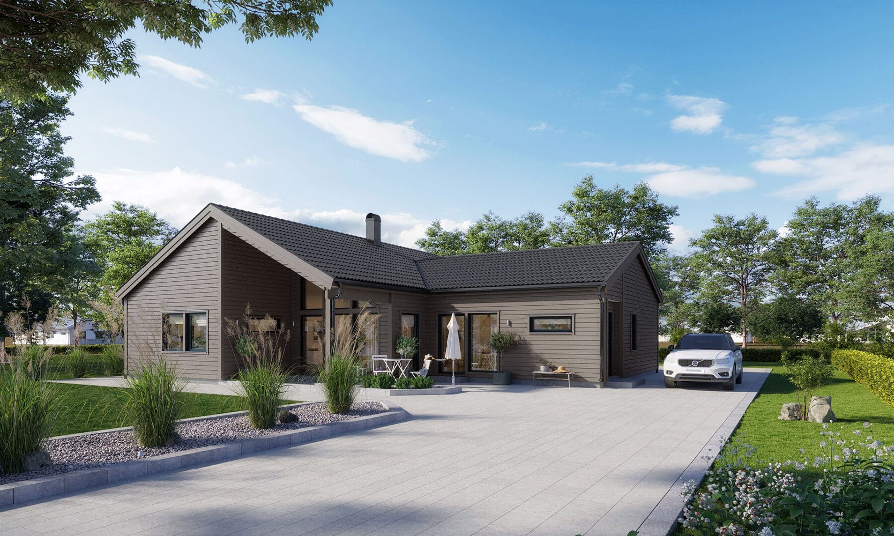 Familjens drömtomt fanns i ett lummigt villaområde på landet. En stor tomt med goda förutsättningar. Familjens drömhus fanns i Eksjöhus katalog, i form av Solängen, en familjevänlig 1-plansvilla med härliga vinklar och iögonfallande trapetsfönster.