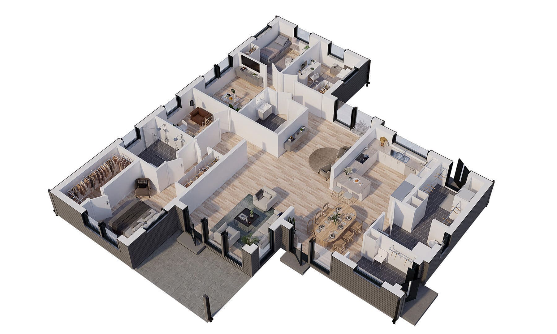 – Resultatet av vår justering blev två stora uteplatser längs husets långsidor, med morgon- respektive kvällssol. På så sätt nyttjades tomten till max och familjen kan välja mellan sol eller skugga på uteplatserna, beroende på väder och aktivitet, förklarar Johan.