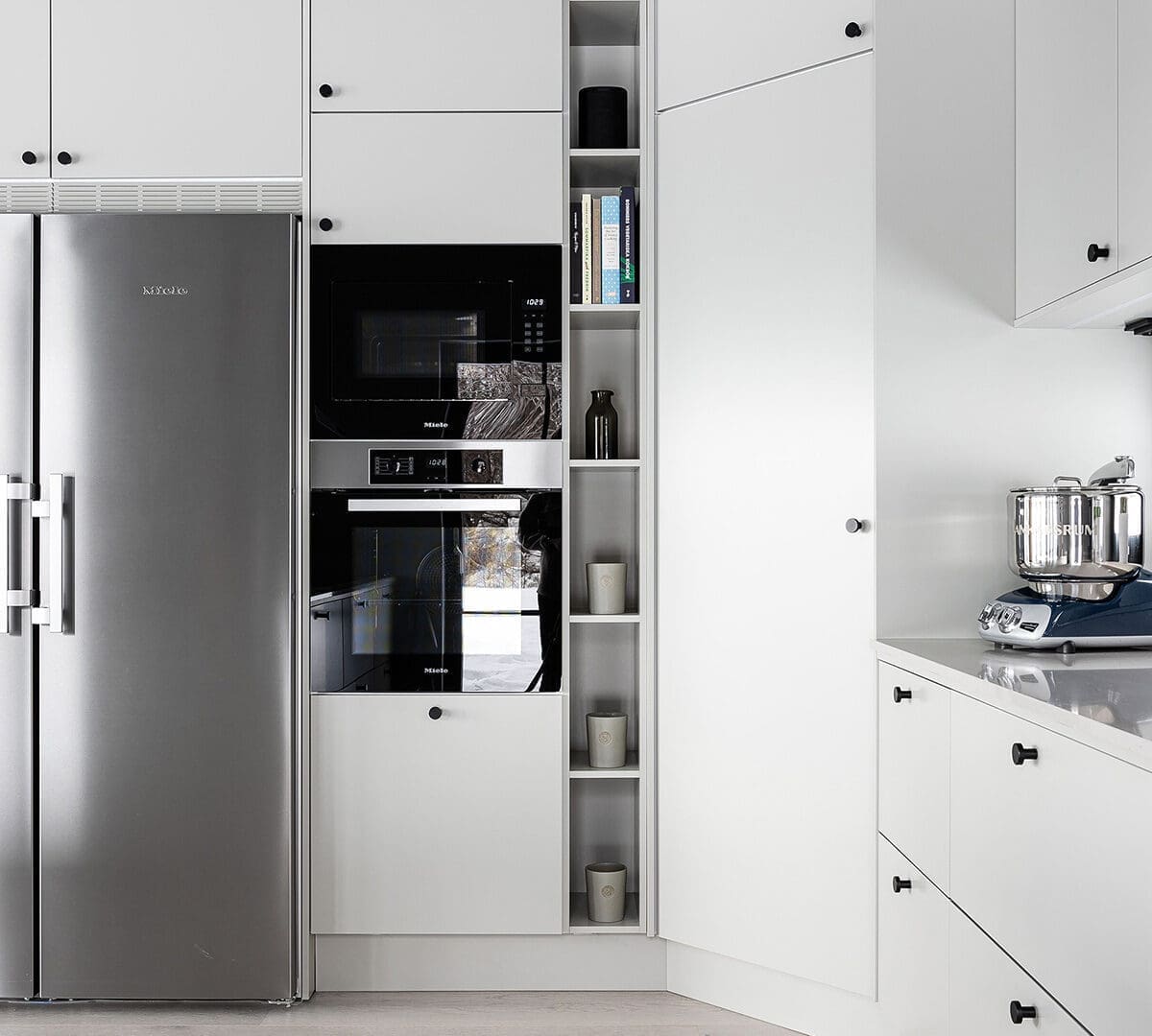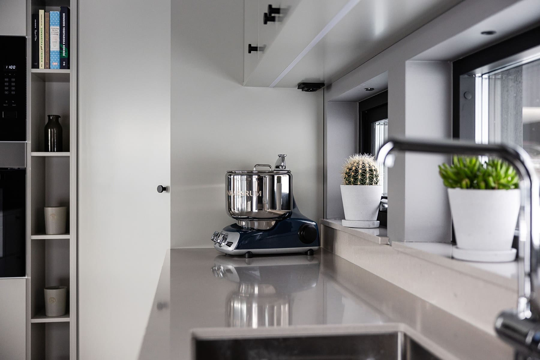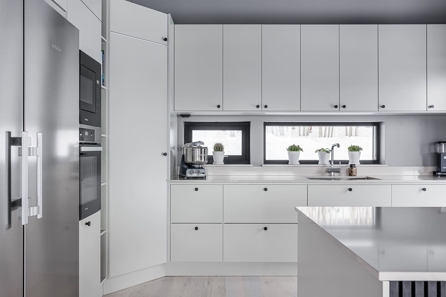 Utöver att bjuda in naturen, ville Tobias och Magnus också skapa ett hem med plats att bjuda in vänner och bekanta. Tobias, som älskar att laga mat, önskade ett stort kök med generösa ytor och gott om förvaring. Och så blev det. Genom att låta förhöja köksskåpen, förstora köksön och bygga ett större skafferi skapade man rum för både större förvaring och större matupplevelser i köket.