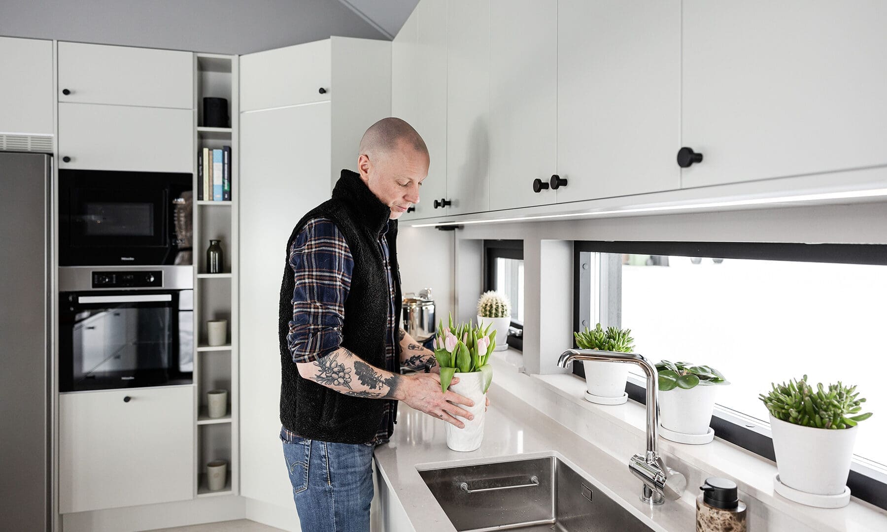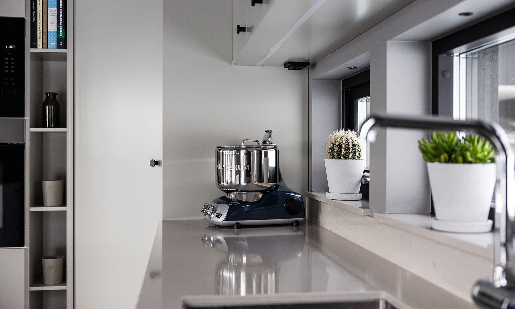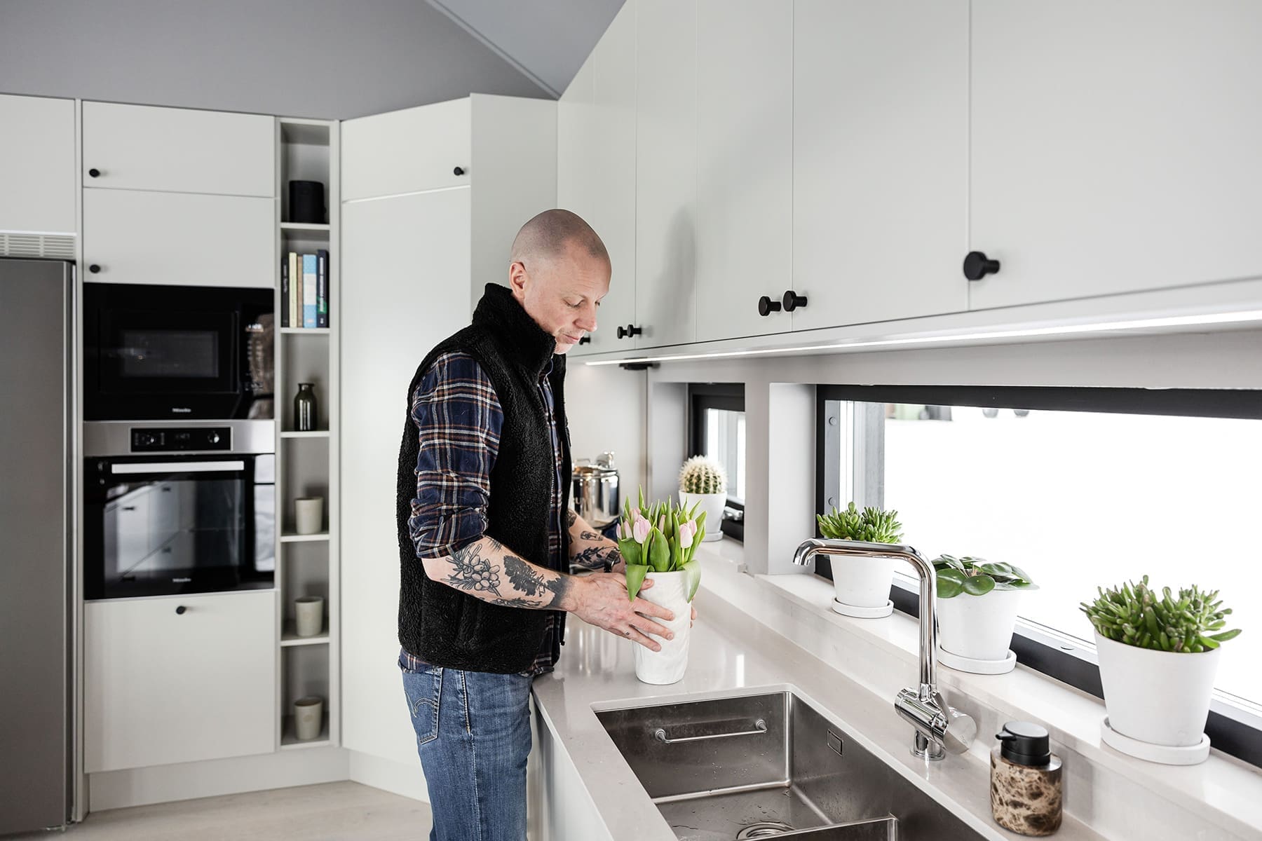 Utöver att bjuda in naturen, ville Tobias och Magnus också skapa ett hem med plats att bjuda in vänner och bekanta. Tobias, som älskar att laga mat, önskade ett stort kök med generösa ytor och gott om förvaring. Och så blev det. Genom att låta förhöja köksskåpen, förstora köksön och bygga ett större skafferi skapade man rum för både större förvaring och större matupplevelser i köket.