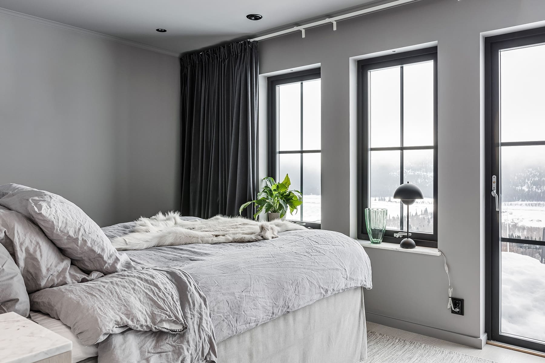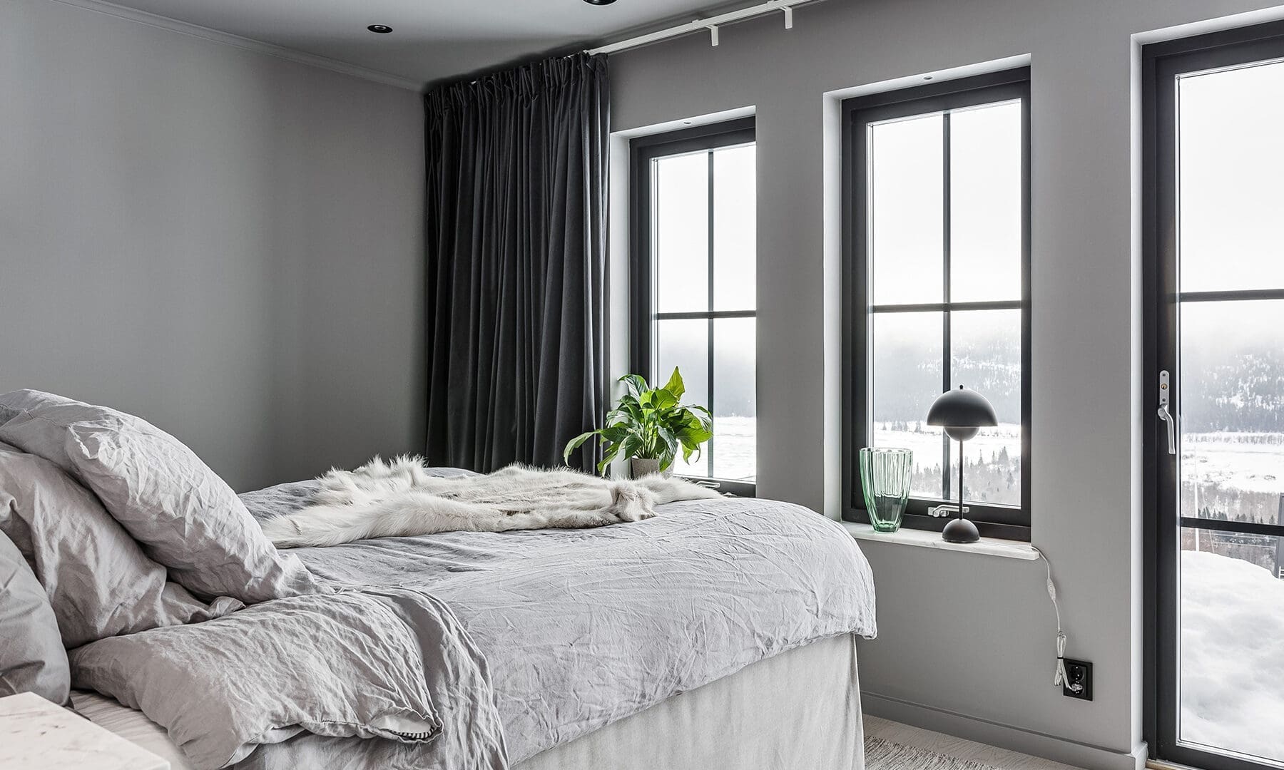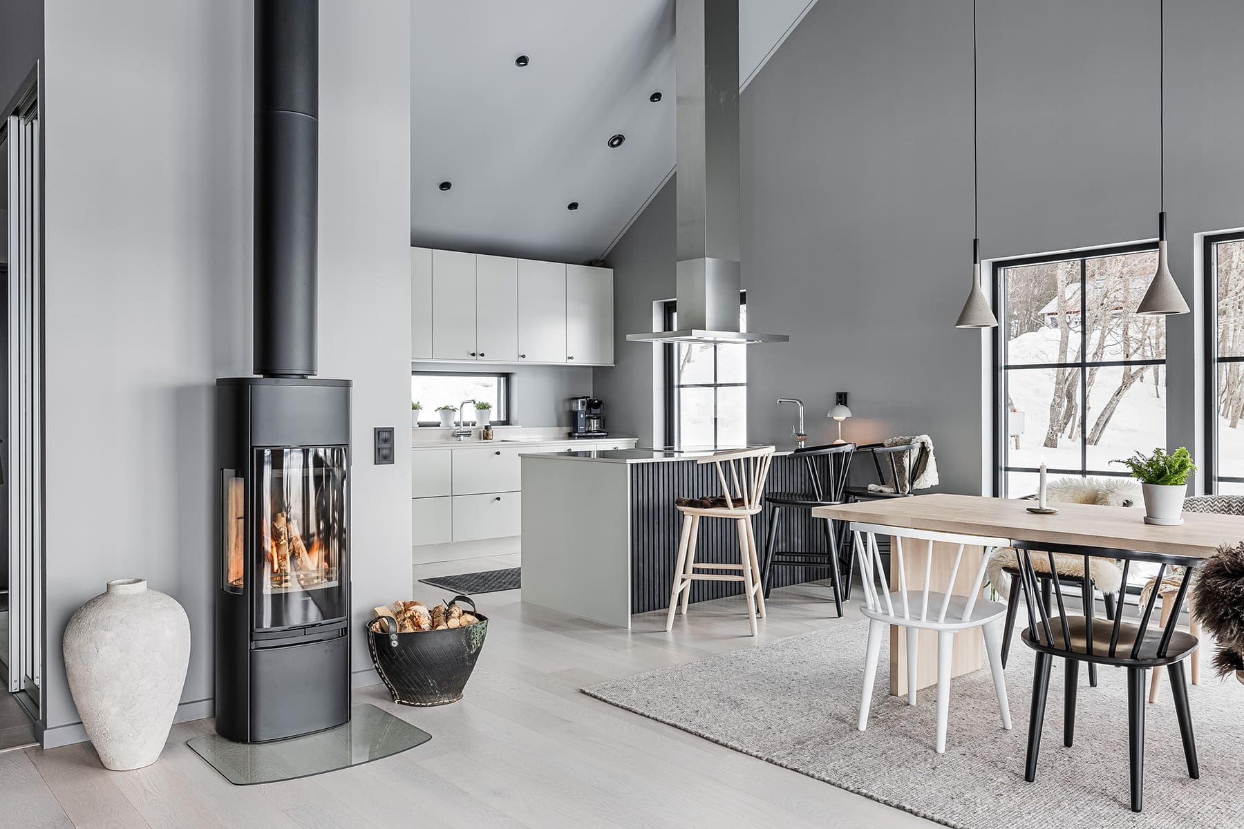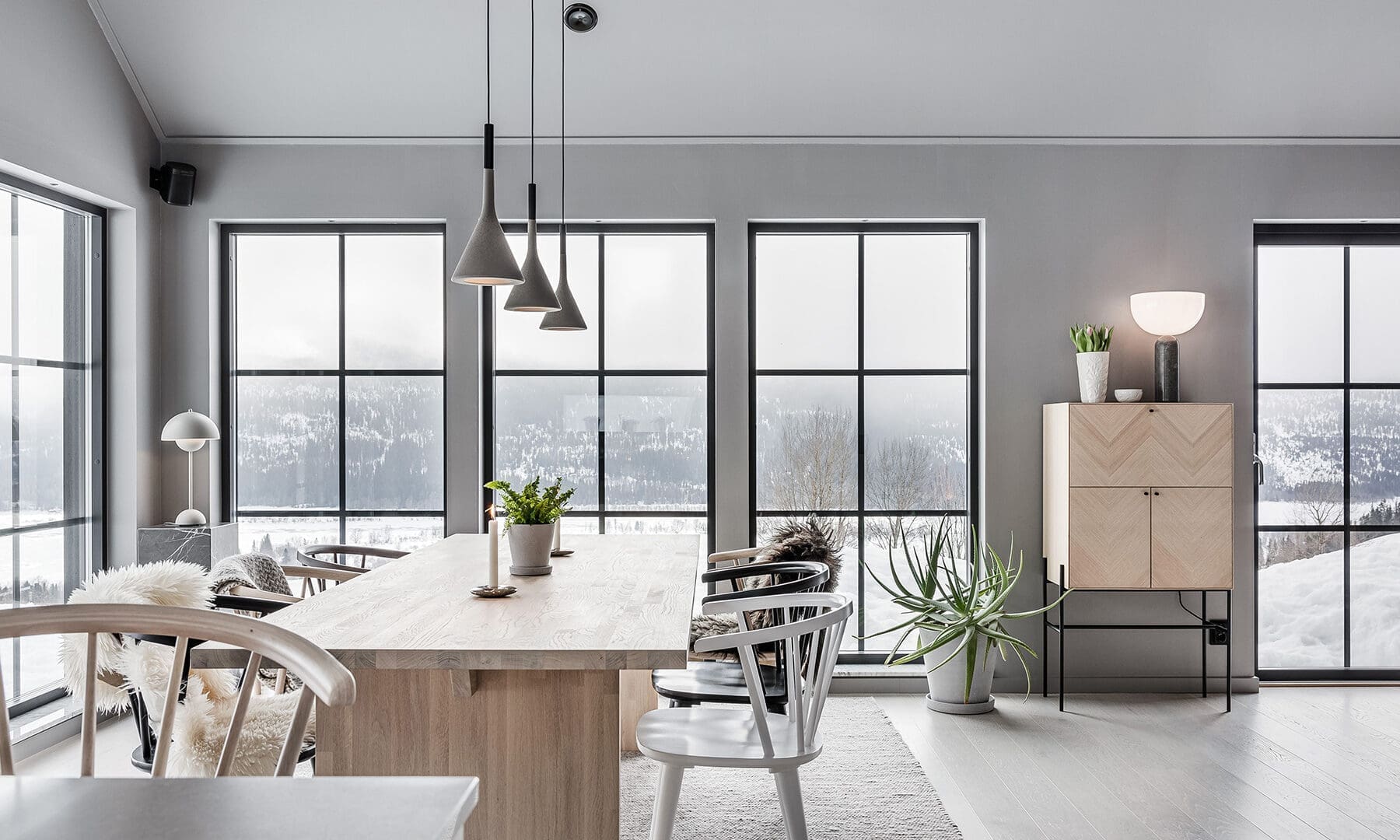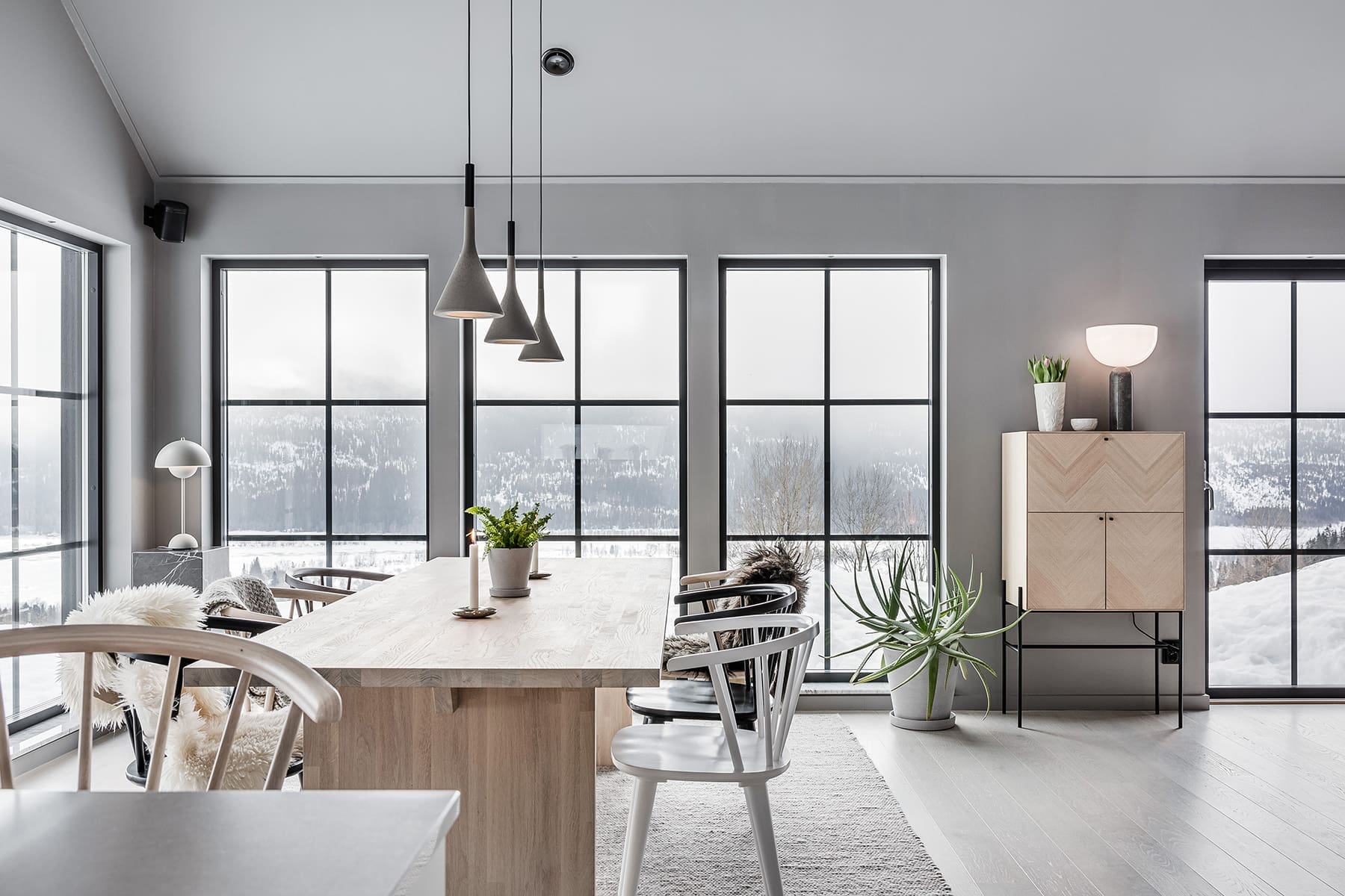 – Vi ville skapa en enhetlig stil som vi båda trivdes i och samtidigt komma så långt ifrån en traditionell fjällstuga vi bara kunde. Vi ville också spegla det omgivande landskapet, och inspirerades därför mycket av naturnära material som bränt trä och gråsten.