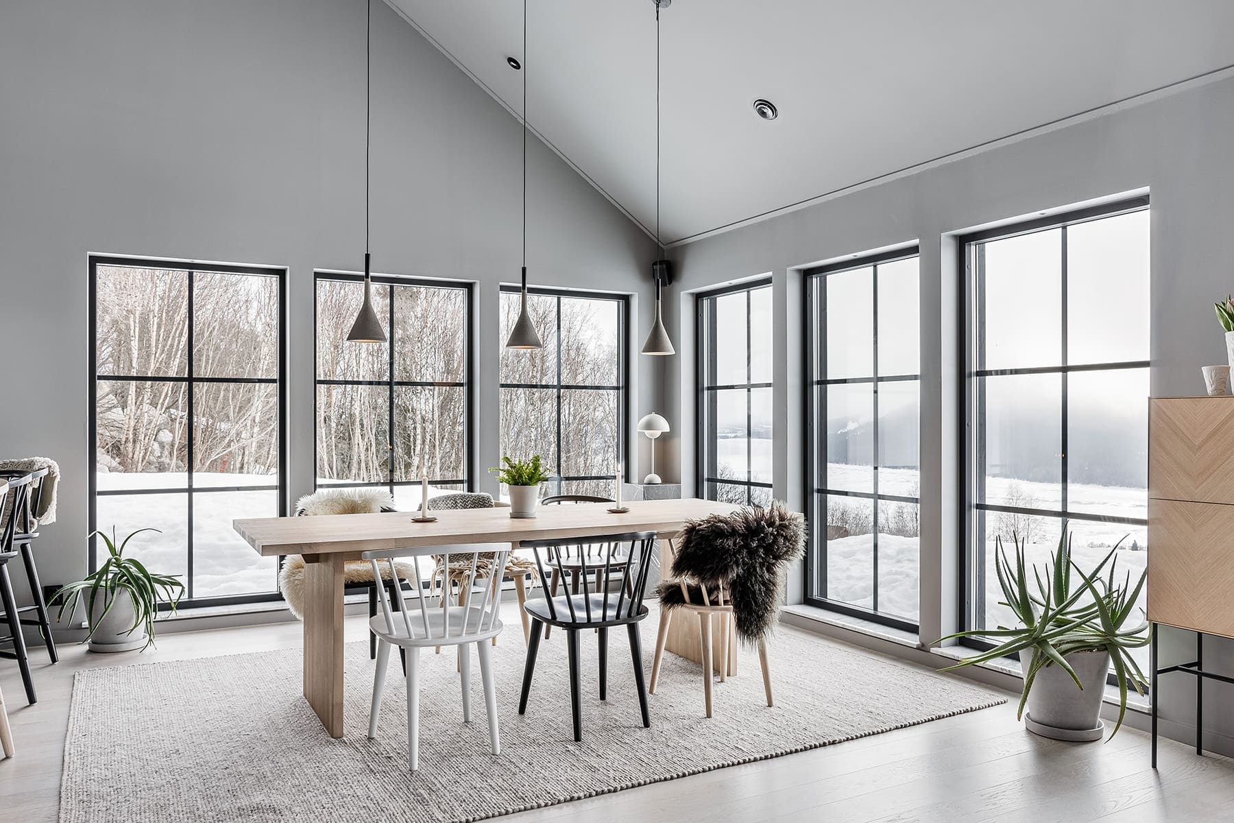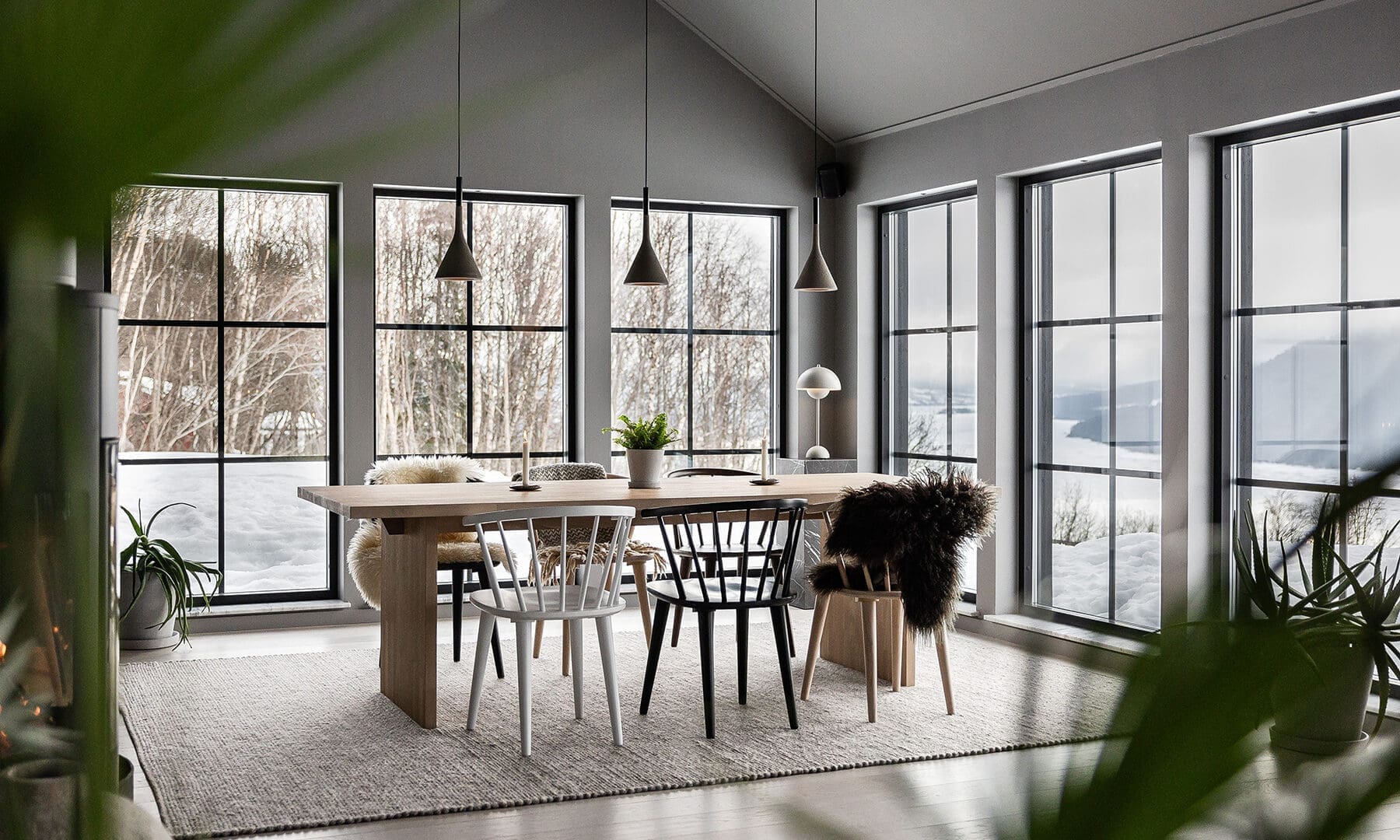 – Vi funderade mycket över både ljus och ljud i huset eftersom vi valde bort gardiner. Det resulterade i akustikpaneler som vi är otroligt nöjda med. Tillsammans med glaspartierna bidrar de till att knyta ihop ute med inne, där panelernas svarta träribbor plockar upp den mattsvarta fasaden.