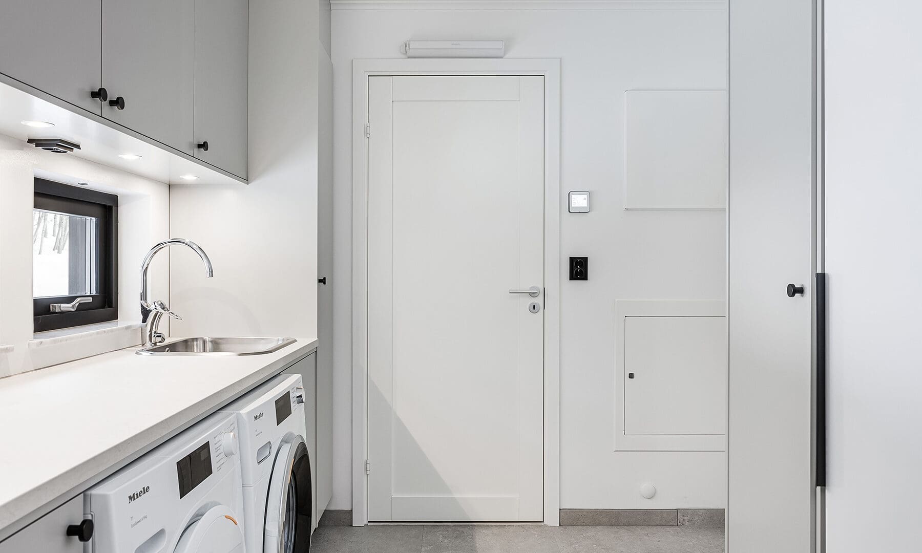 Just extra förvaring är något som kännetecknar parets skräddarsydda Karlsö. Skafferiet i köket krävde att den ursprungliga köksingången flyttades, vilket skapade en extra hall med, just det, extra förvaring. Även förvaringen i tvättstugan och groventrén utökades för att rymma det nya livet i Åre.