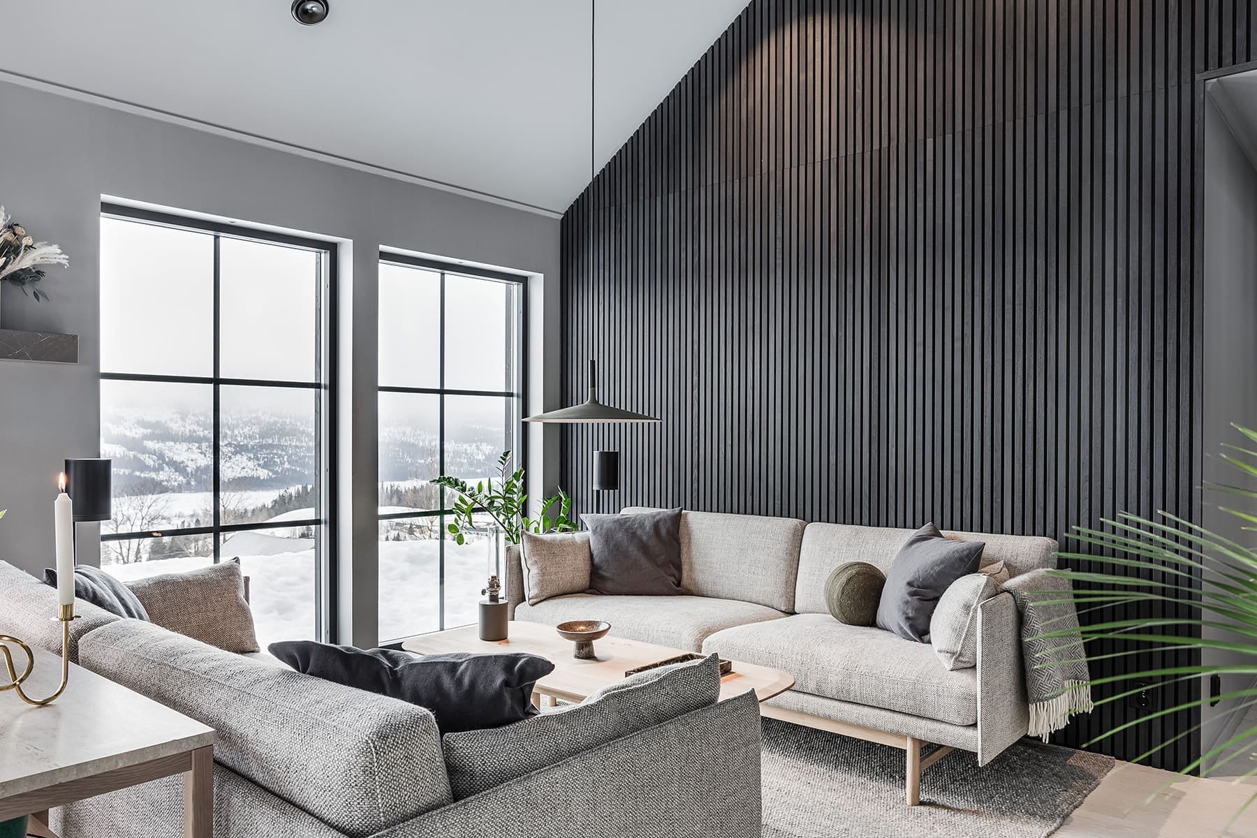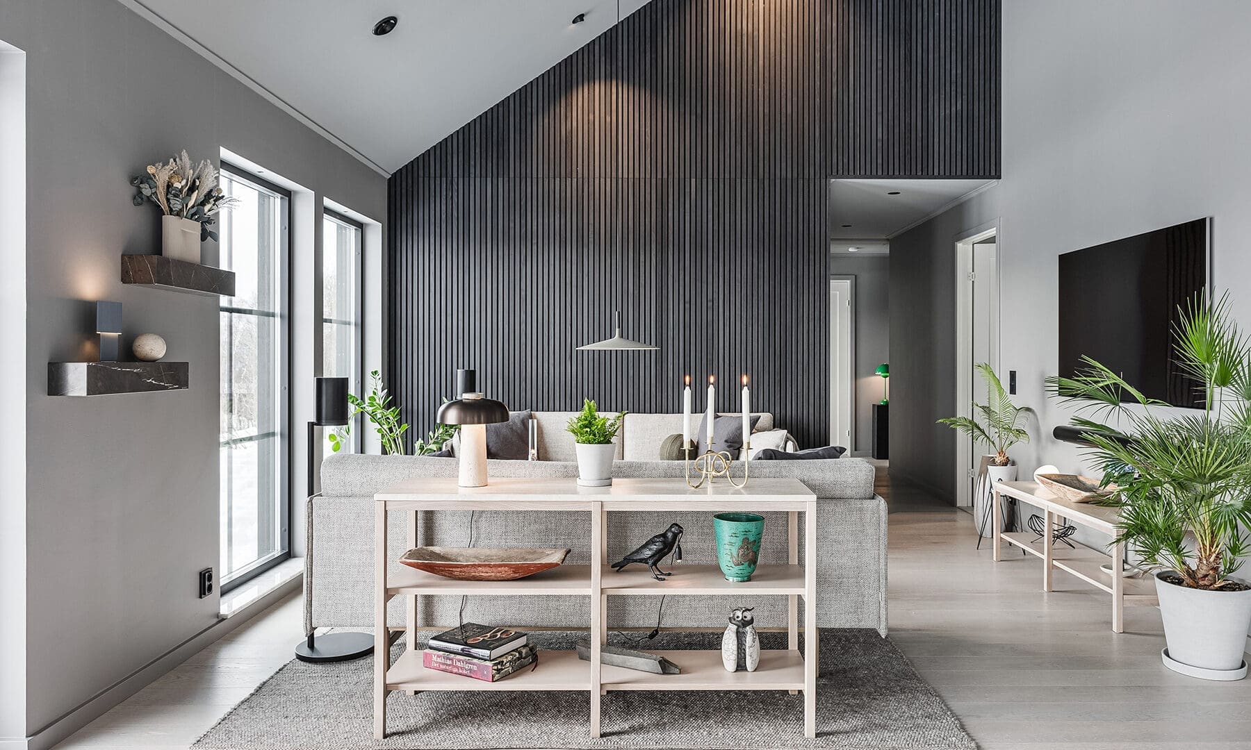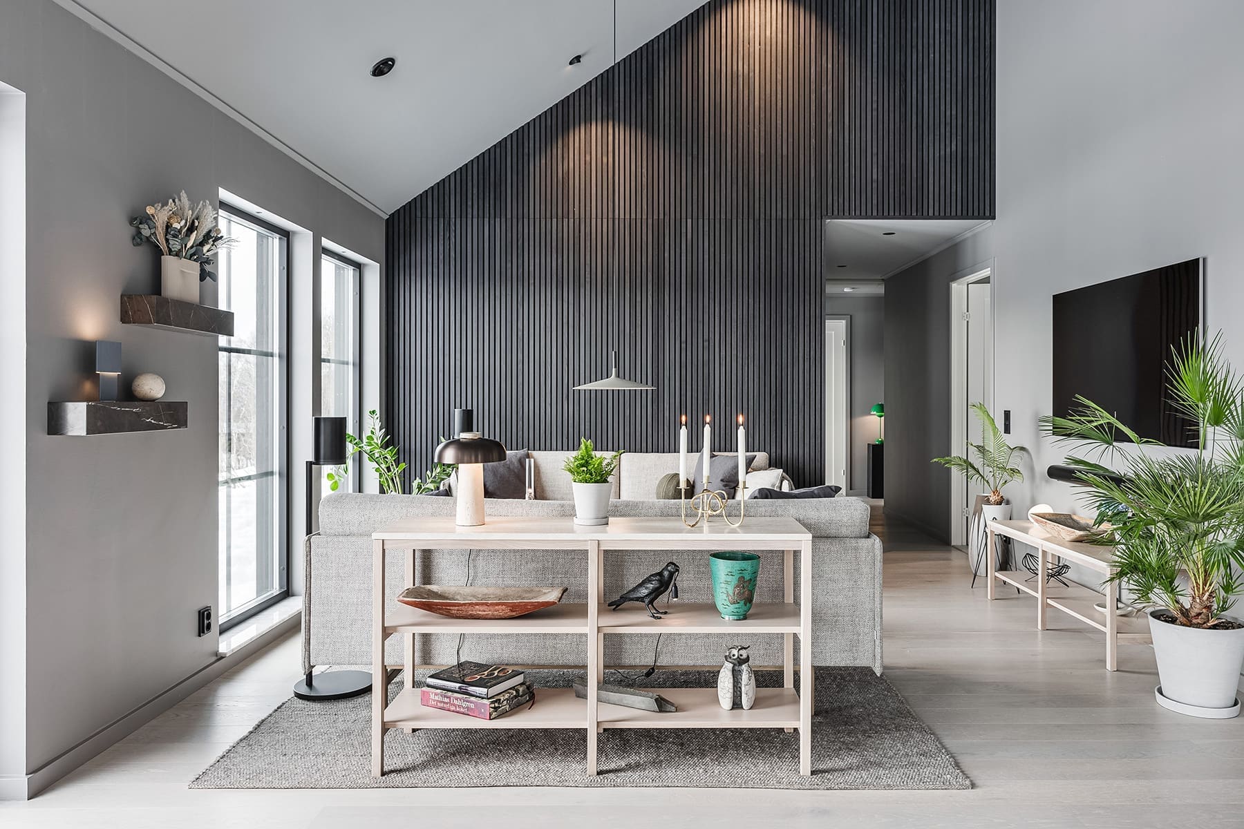 En oväntad, men lyckad, inredningsdetalj är den akustikpanel som Tobias och Magnus valde att sätta in i huset. Panelerna döljs med ribbor av svart ask och blir därmed en både praktiskt och stilfull inredningsdetalj.