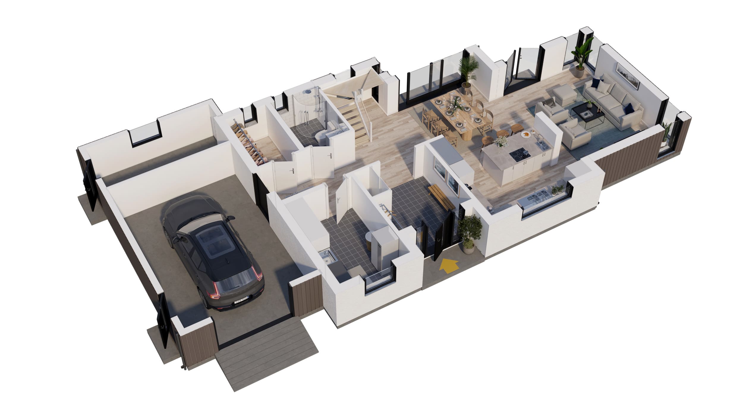 – Genom att flytta entrén till framsidan och tvättstugan till gaveln skapade vi möjlighet för ett kopplat garage med groventré in i huset. En stor favorit bland barnfamiljer, då du bara har ett par meter från bilen till avlastningsytor för kläder och utrustning, förklarar Johan.